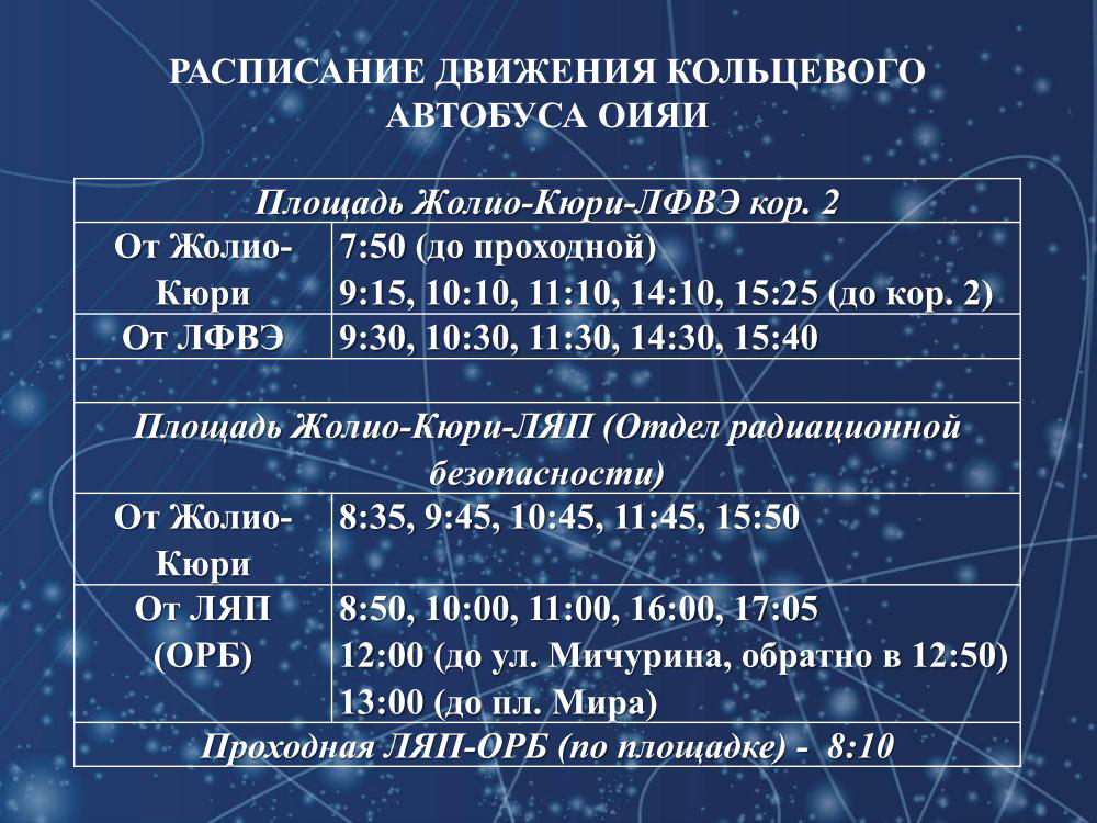Кольцевой автобус ОИЯИ работает с понедельника по пятницу (кроме официальных выходных дней и Дня основания ОИЯИ).
