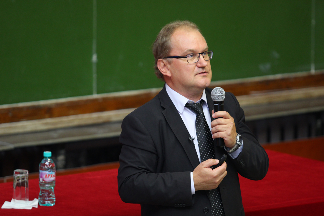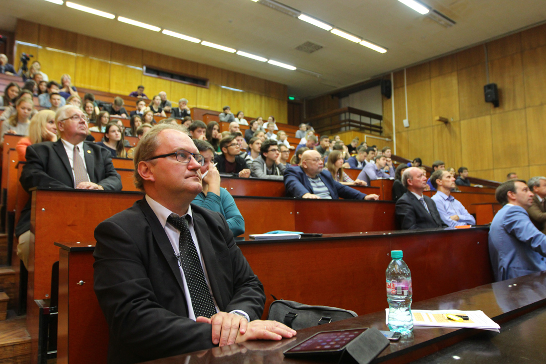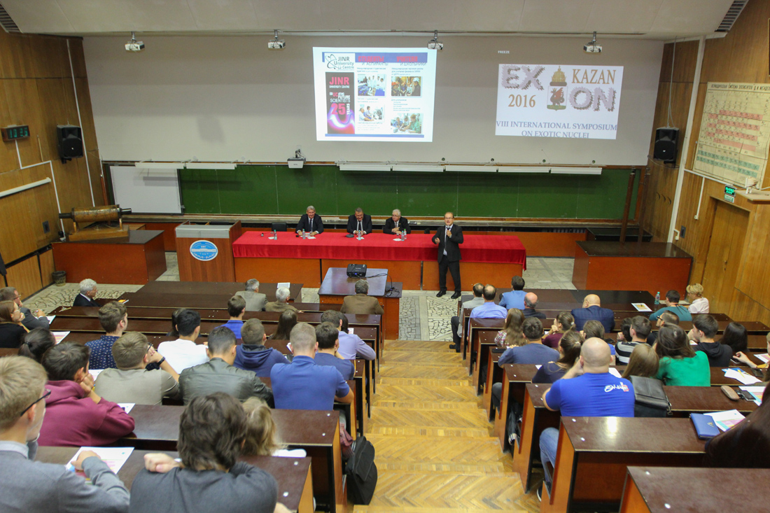 Студентов и аспирантов Казанского университета приветствовал директор Института Физики КФУ С.И. Никитин, проректор по образовательной деятельности КФУ Д.А. Таюрский, Председатель оргкомитета симпозиума Ю.Э. Пенионжкевич и Председатель оргкомитета школы С.З. Пакуляк. В первый день участники школы прослушали ряд лекций по современной ядерной физике, а также узнали о деятельности и направлениях исследований ОИЯИ, а именно о синтезе сверхтяжелых элементов в Лаборатории ядерных реакций ОИЯИ, об экспериментах с экзотическими ядрами, проводимых в ОИЯИ, о проекте формата мегасайенс NICA – сверхпроводящем коллайдере тяжелых ионов, строящемся в ОИЯИ для изучения барионной материи и загадок мироздания, о нейтринной программе в Лаборатории ядерных проблем, о физике конденсированного состояния вещества, исследованиях и экспериментах, проводимых на реакторе ИБР-2 в Лаборатории нейтронной физики ОИЯИ, и ядерном материаловедении.