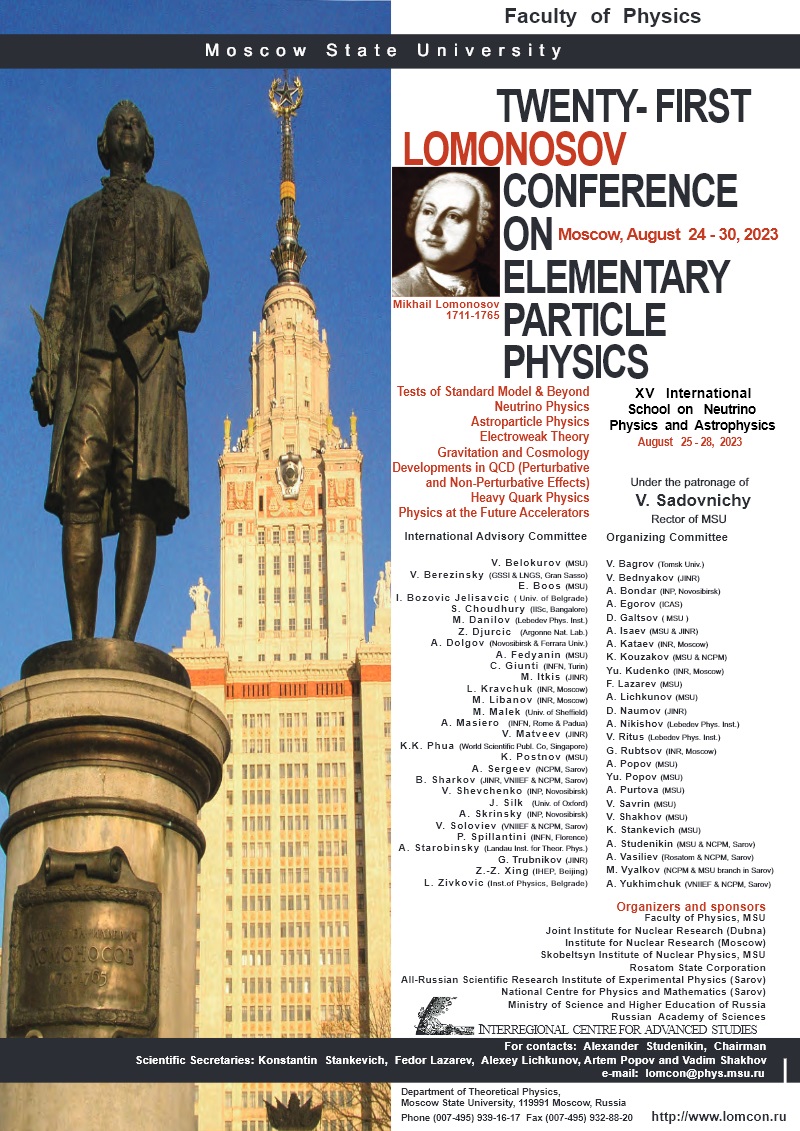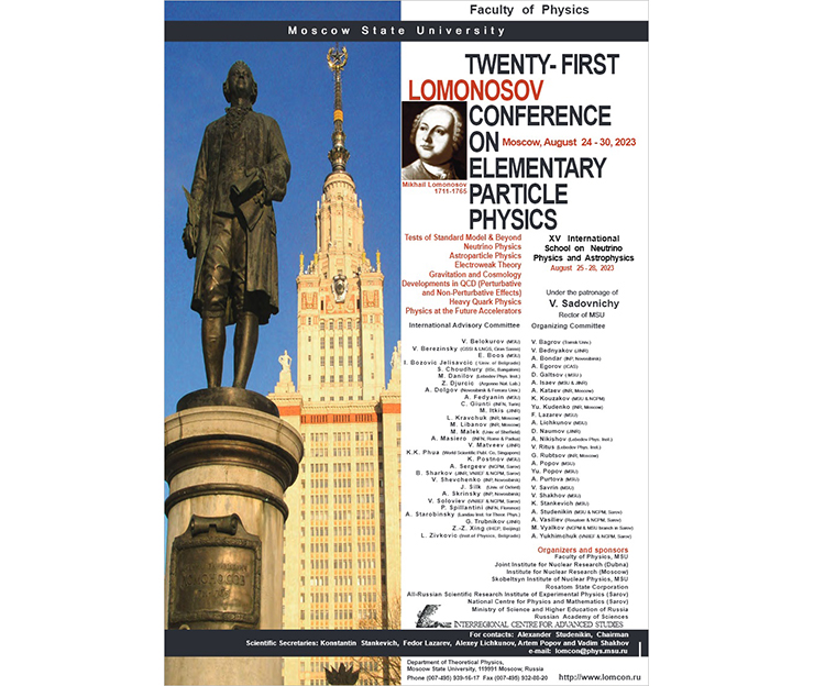 The traditional conference on elementary particle physics is taking place at the Faculty of Physics of Moscow State University (MSU). This year’s event is dedicated to the 90th anniversary of the MSU Faculty of Physics, the 270th anniversary of MSU, and the 300th anniversary of the Russian Academy of Sciences (RAS). The programme of the conference includes the 15th International School on Neutrino Physics and Astrophysics, dedicated to the 110th anniversary of the birth of Bruno Pontecorvo.