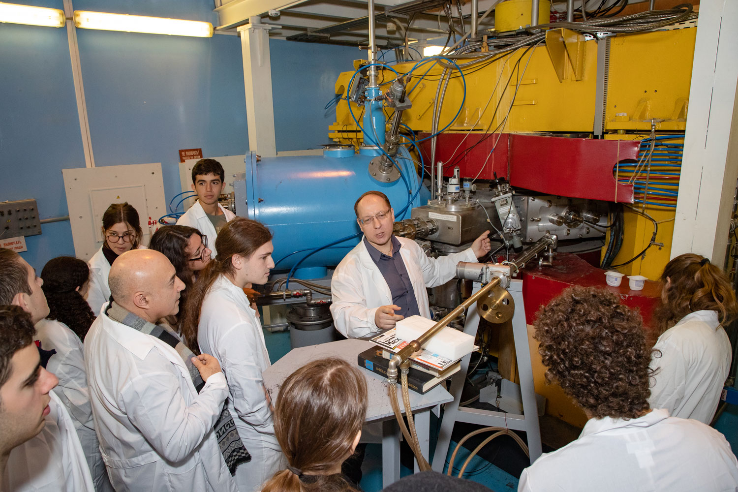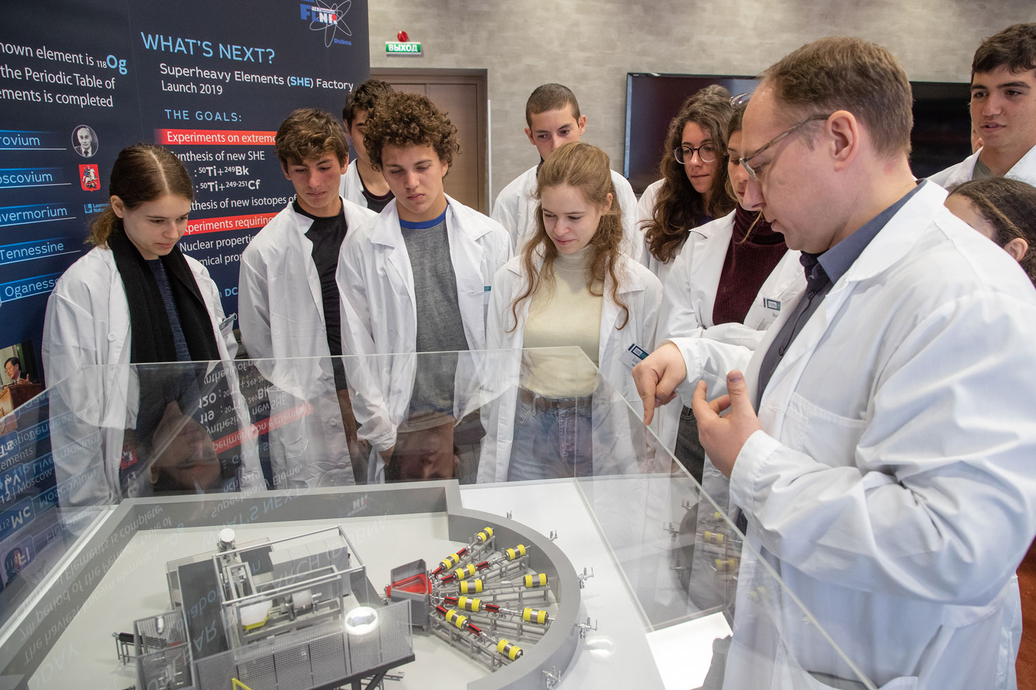 The second day of the visit of the Israeli group began in the Laboratory of Nuclear Reactions with a lecture by A. Karpov. During the lecture, he told the students about the discovery of chemical elements, introduced to the children the latest achievements made by FLNR scientists in the fields of fundamental and applied research, and shared the plans that the Laboratory staff is going to implement by means of the new accelerator DC-280 of the Factory of Superheavy Elements. The visit was continued with a tour to the accelerator IC-100, which was conducted by A. Voinov. During this excursion, the guests learned about the operation principles of the facility and applications of track membranes and nanostructures obtained using the accelerators.