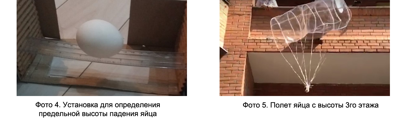 Проект «Парашют» (руководители – Алексей Любомирович Гибинский, Павел Львович Лучинин, Петр Дмитриевич Ширков) был направлен на введение участников в мир экспериментальной физики, что и являлось ведущей целью руководителя. Цель проекта с точки зрения слушателей была связана с необходимостью сконструировать парашют, обеспечивающий мягкую посадку куриного яйца на твердую поверхность. Для этого ребята спланировали и провели серию экспериментов, связанных с определением предельно допустимой высоты падения куриного яйца, определения законов кинематики. Процесс свободного падения тел снимался на фоне мерной ленты на видео и обрабатывался по кадрам. Результатом такой пропедевтики экспериментальной физики стала оценка необходимой площади парашюта. К всеобщему восторгу и детей, и наставников, и родителей летные испытания прошли успешно.