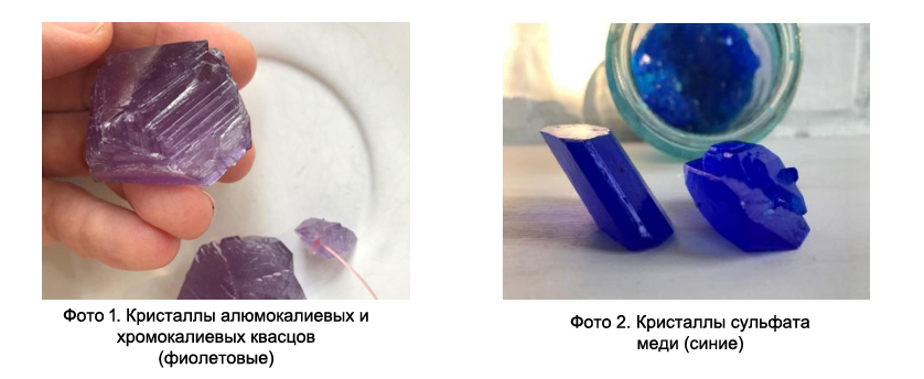 В проекте «Кристаллы» (руководители проекта Наталья Игоревна и Николай Морозовы) слушатели изучали возможность выращивания кристаллов «на кухне», в домашних условиях, выясняли ключевые факторы, влияющие на скорость роста и форму. Цель проекта с точки зрения участника: вырастить кристаллы и выяснить, почему они такие красивые. Цель проекта с точки зрения руководителя: становление и развитие экспериментальных навыков (работа с весами, мерной посудой, растворами); развитие представлений о симметрии и геометрического воображения вообще; формирование связей между первичными характеристиками вещества (строение атомов и молекул) и свойствами вещества (температура плавления, растворимость, форма кристаллов…).