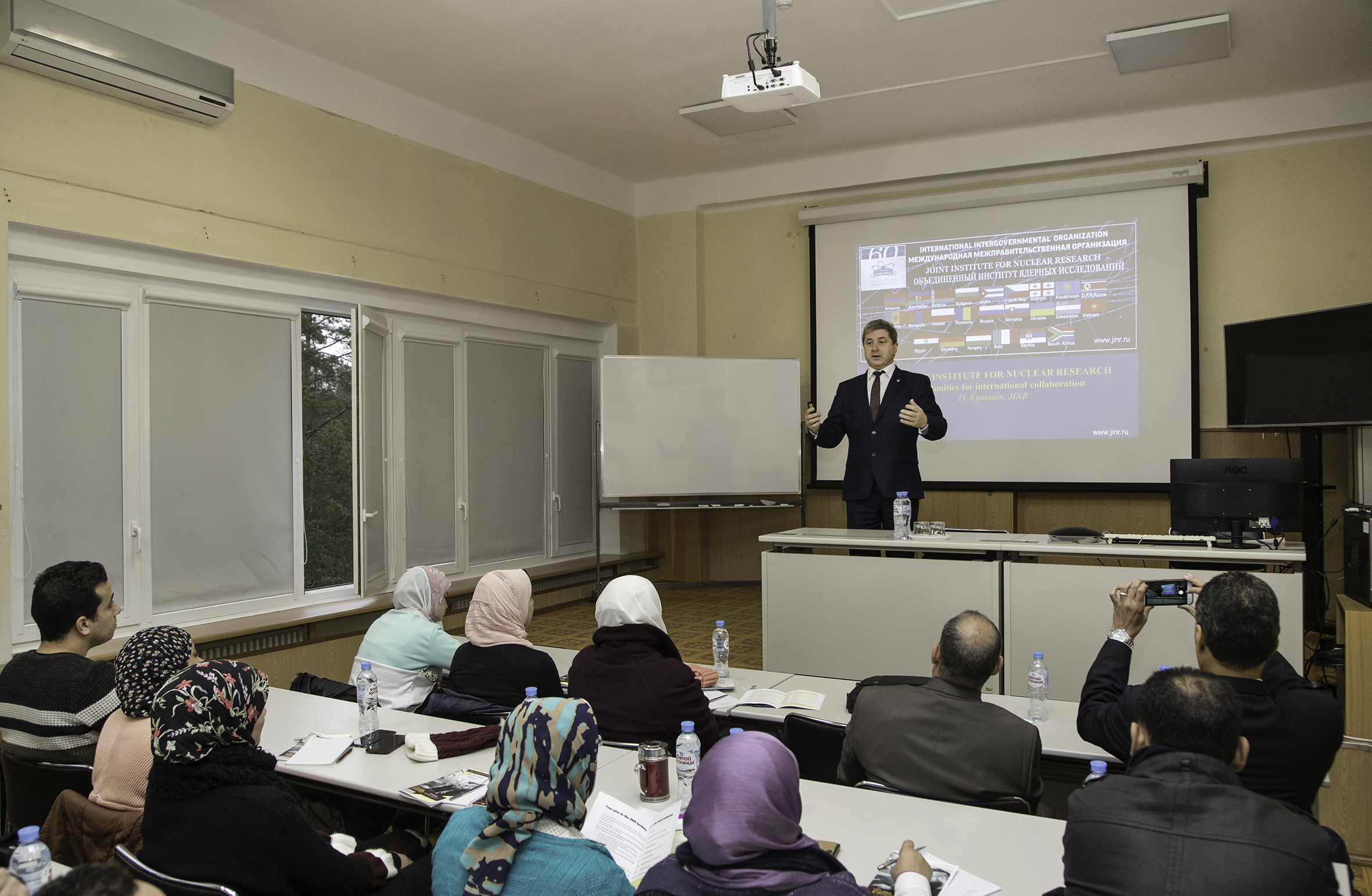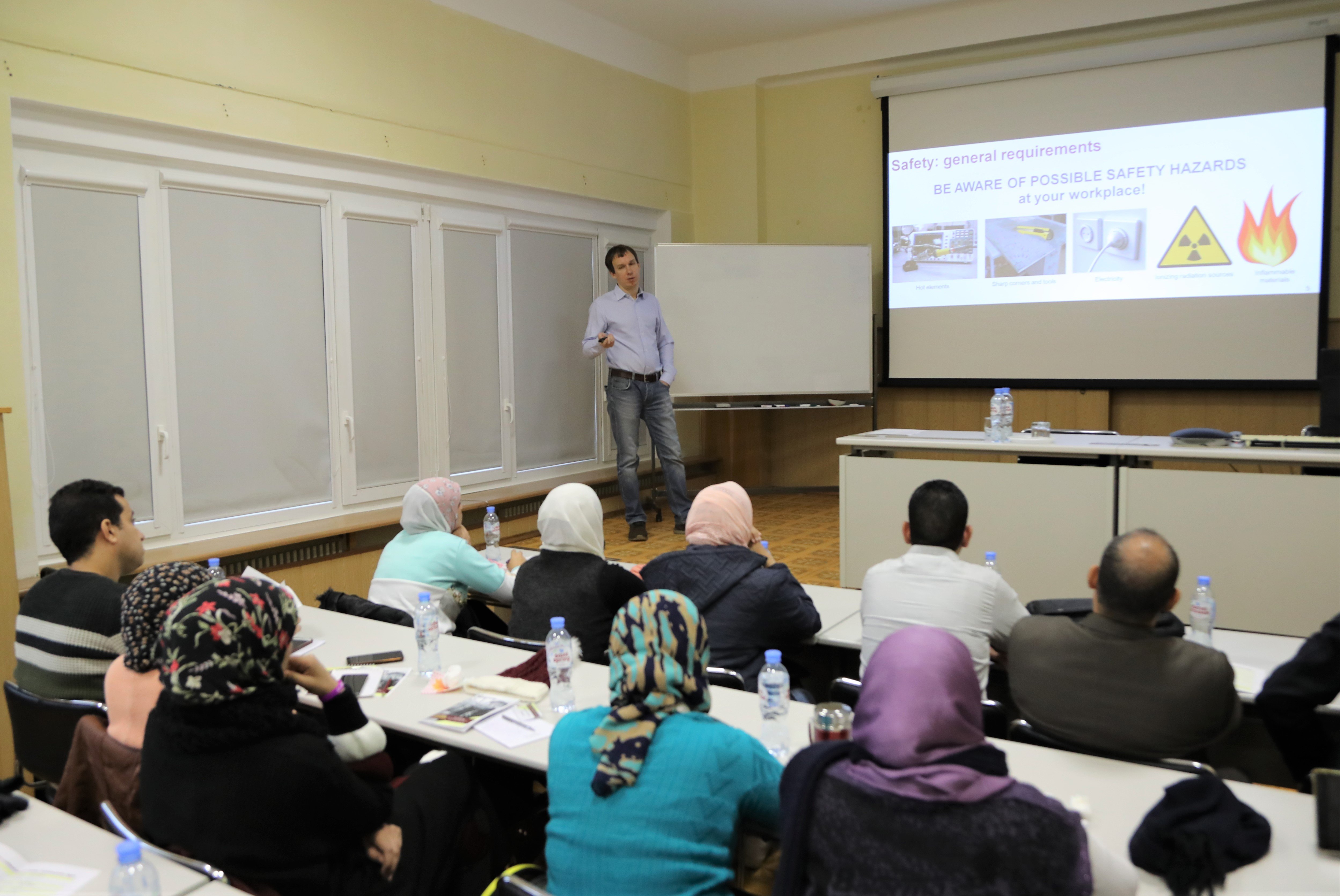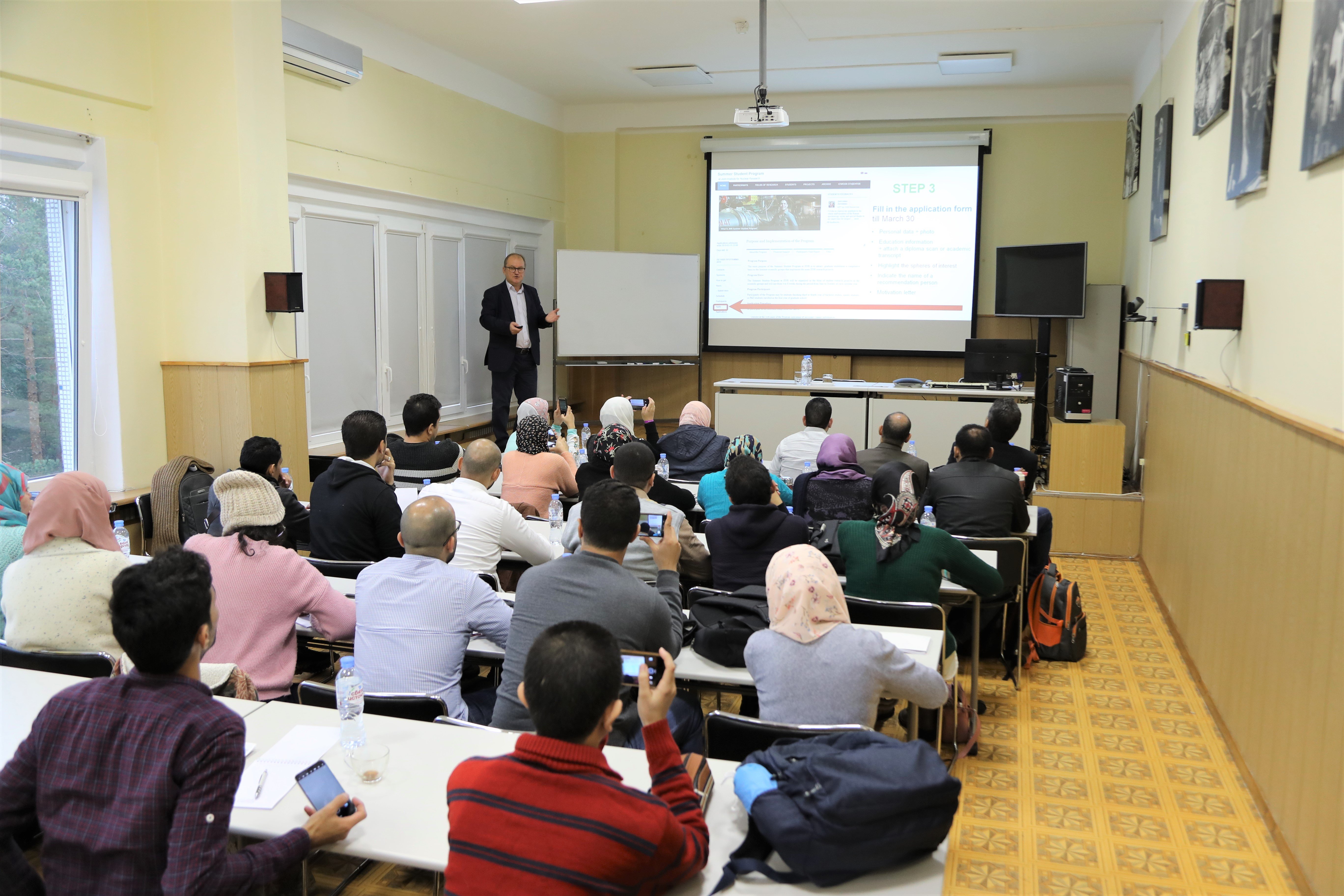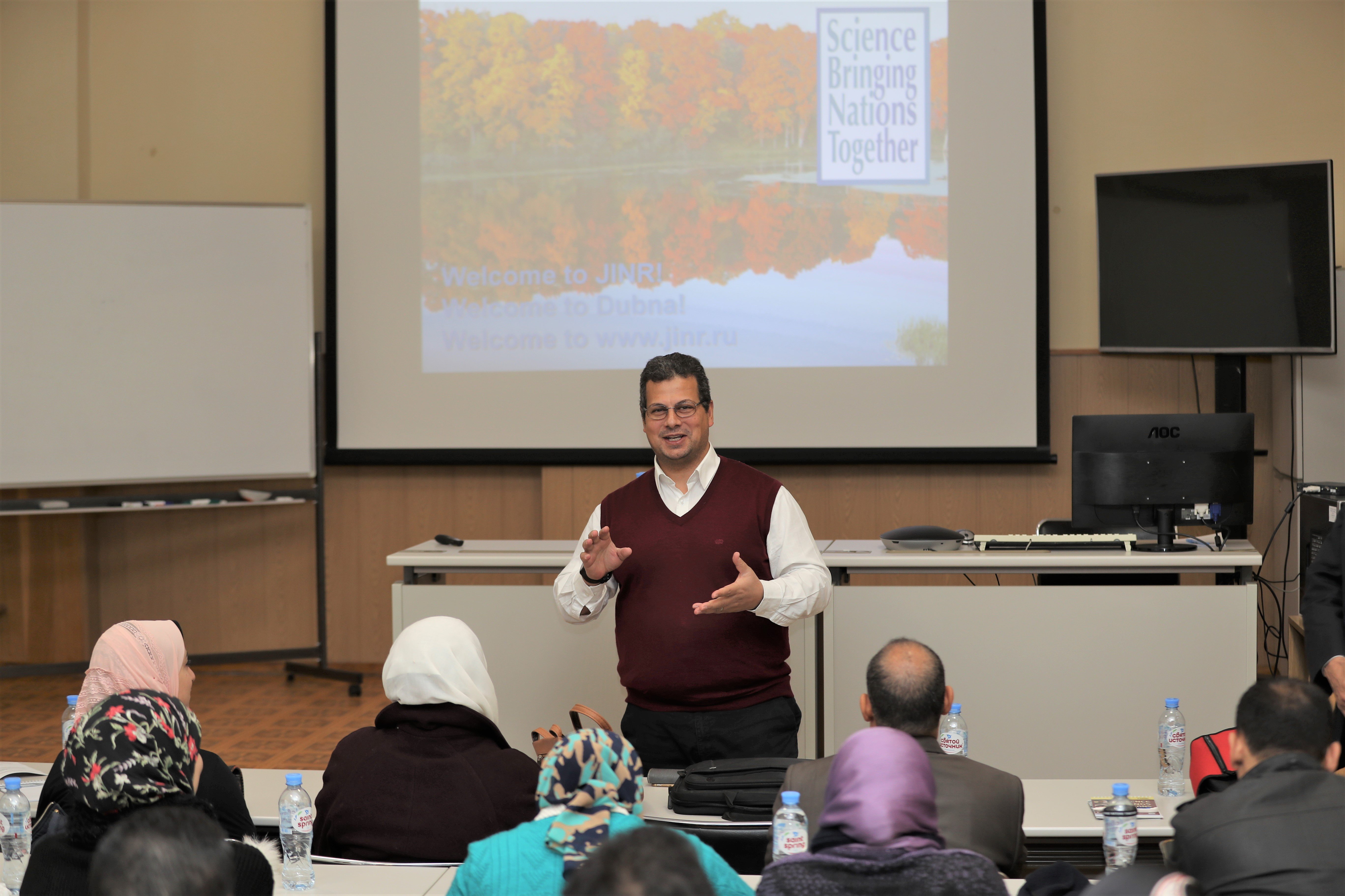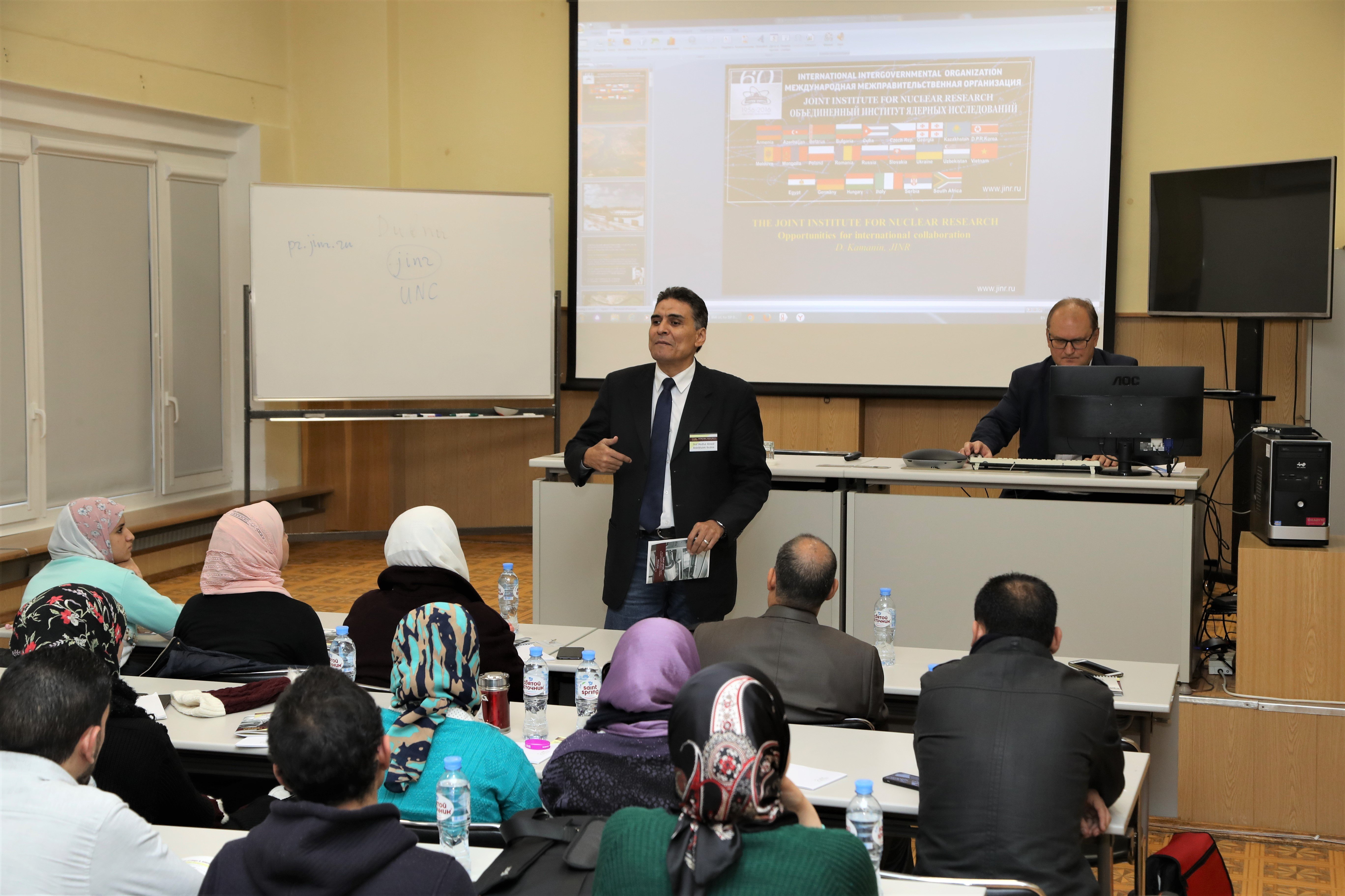 On Monday, 9 December 2019, the 4th stage of the International Student Practice organized by the JINR University Centre started. 25 students from the Arab Republic of Egypt came to Dubna for participation in the practice together with Prof. Walaa Mohamed Seif Hamouda from the Cairo University and Prof. Medhat Ahmed Abdelkhalek Ibrahim from the National Research Centre. Participants from Egypt were selected due to the interview that was held with the applicants at the Academy of Scientific Research and Technology of ARE.