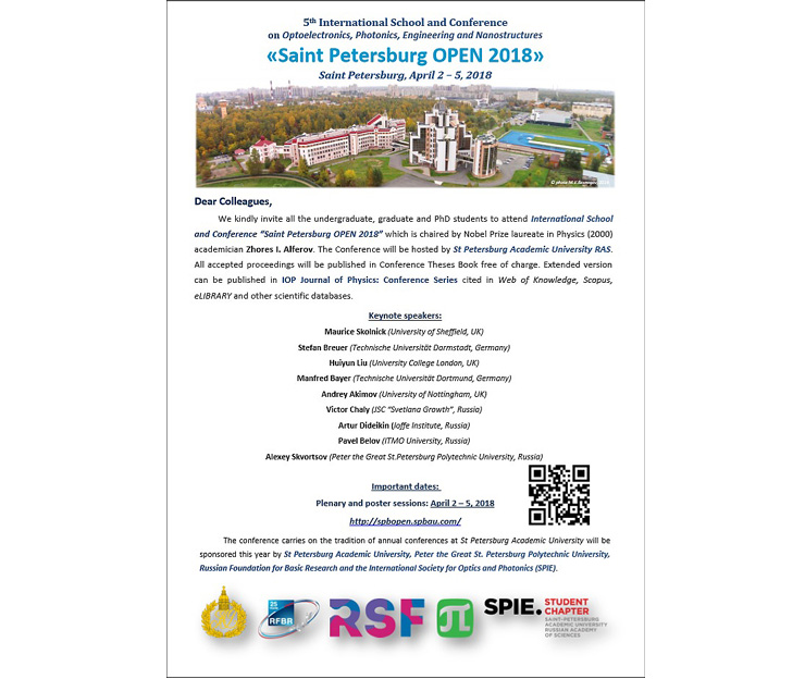 Undergraduate, graduate and PhD students are invited to attend the 5th International School and Conference “Saint-Petersburg OPEN 2018” chaired by Nobel Prize Laureate in Physics (2000), academician Zhores I. Alferov. School-Conference with international participation will be held on 2 – 5 April 2018, at St. Petersburg Academic University of the Russian Academy of Sciences.