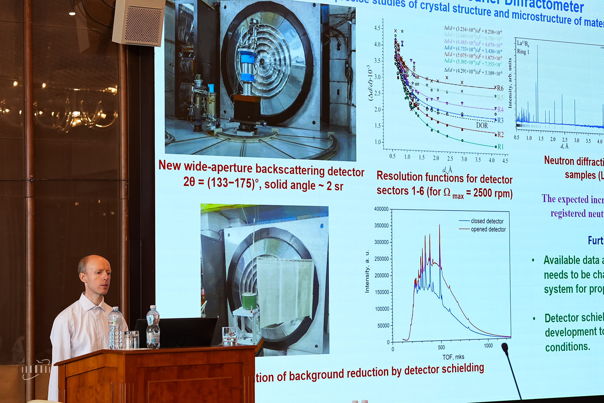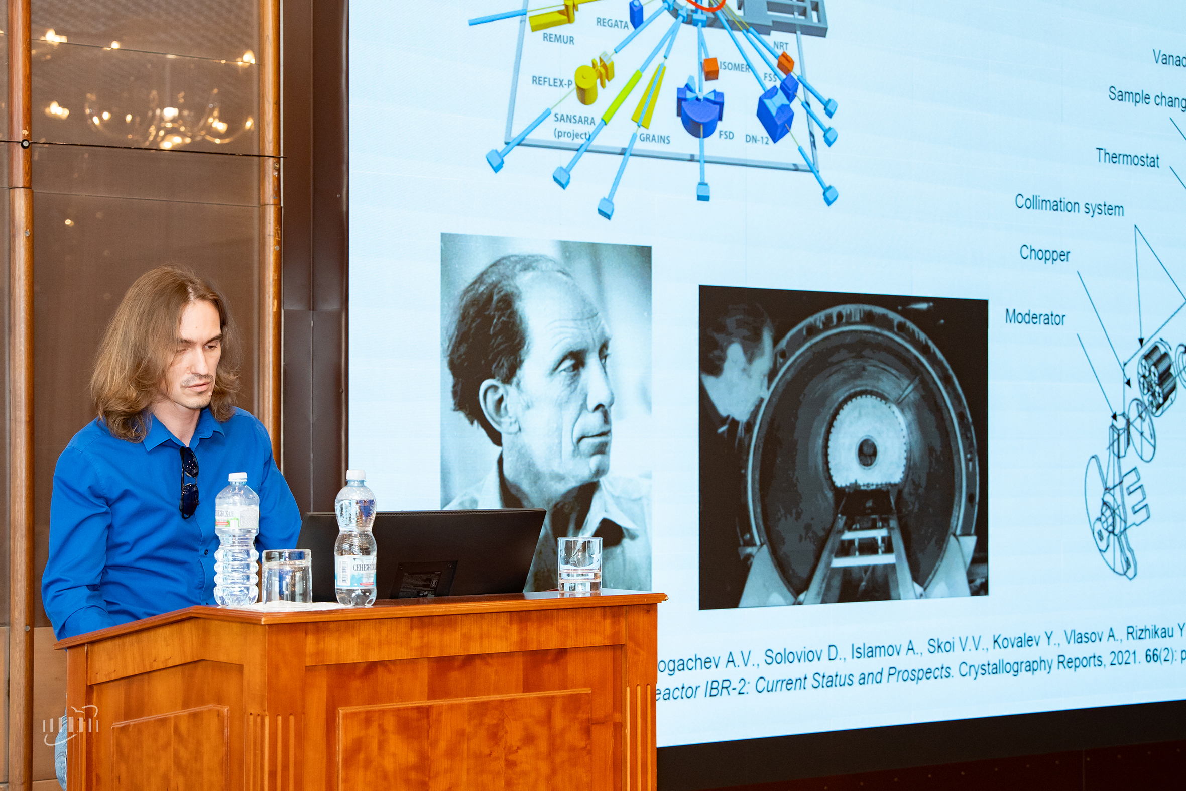 An FLNP senior researcher Oleksandr Ivankov discussed progress of the YuMO Small-Angle Neutron Scattering Spectrometer. He noted that new electronics for position sensitive detector had been tested, the Direct Beam Detector was upgraded, and the chopper was optimised to improve its performance with the cold moderator. The facility’s software is being updated. Specialists plan to reconstruct the spectrometer’s collimation system and modernise its vacuum system.