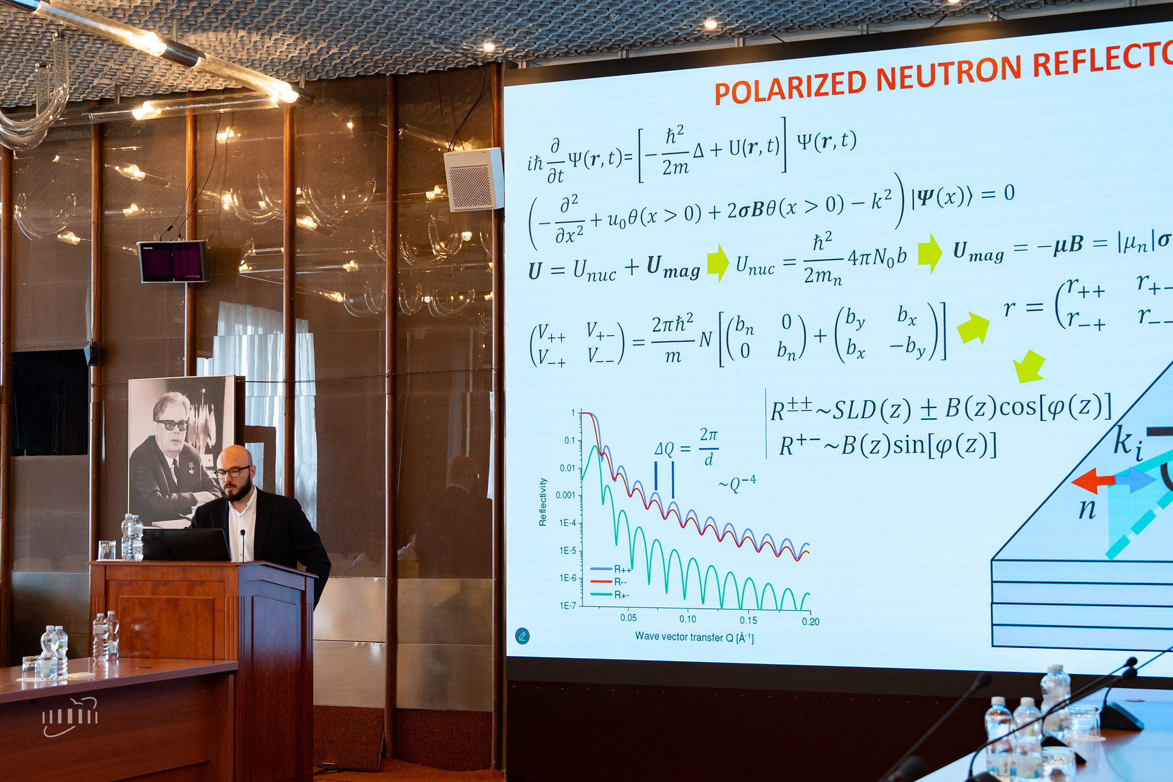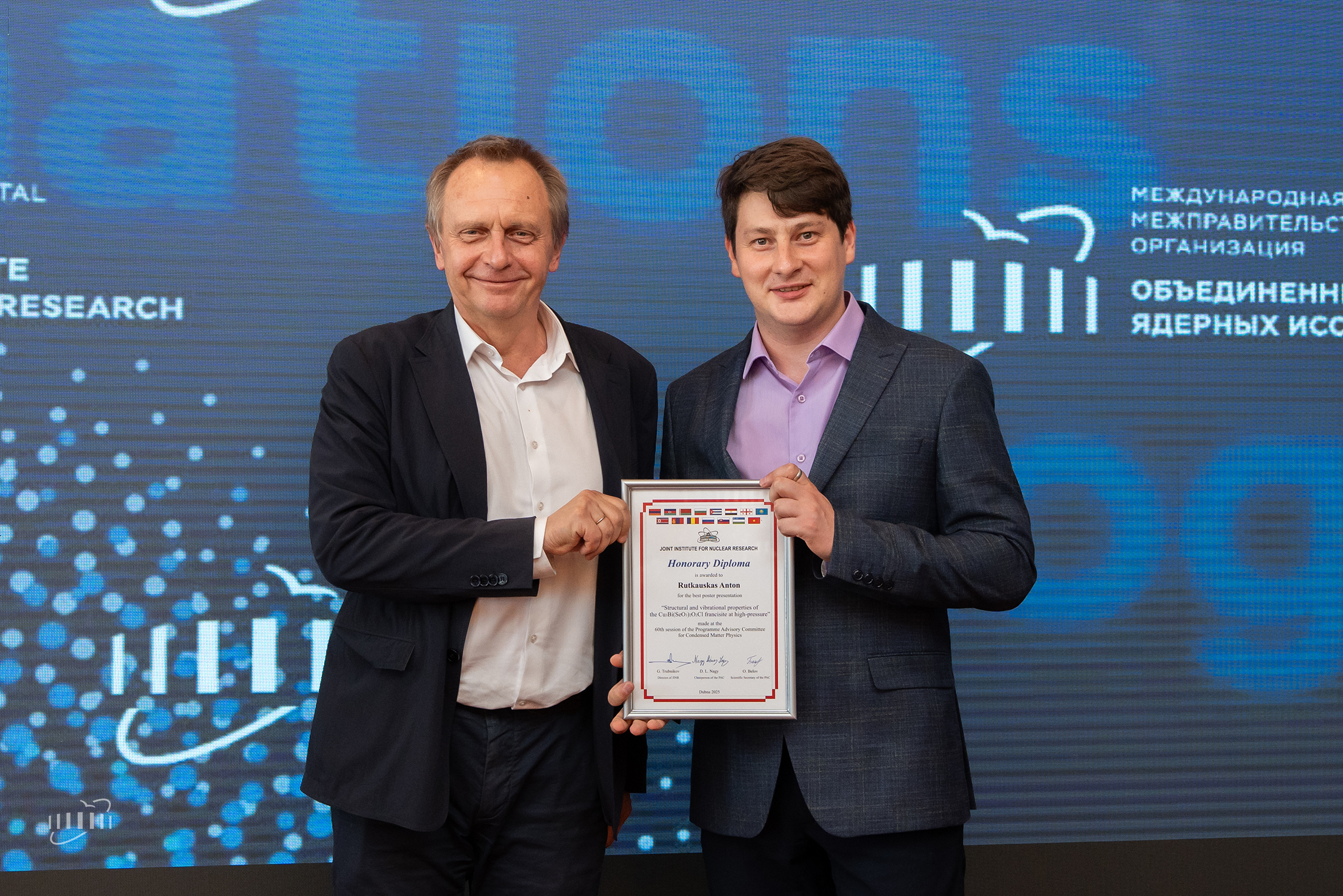An FLNP researcher Vladimir Zhaketov gave a scientific talk “Magnetism and superconductivity in periodic and quasi-periodic low-dimensional layered systems”. A FLNP junior researcher Yersultan Arynbek made a presentation “Conformational dynamics of amyloid-β42 in liposome under varying pH conditions: a combined spectroscopic and computational approach”.