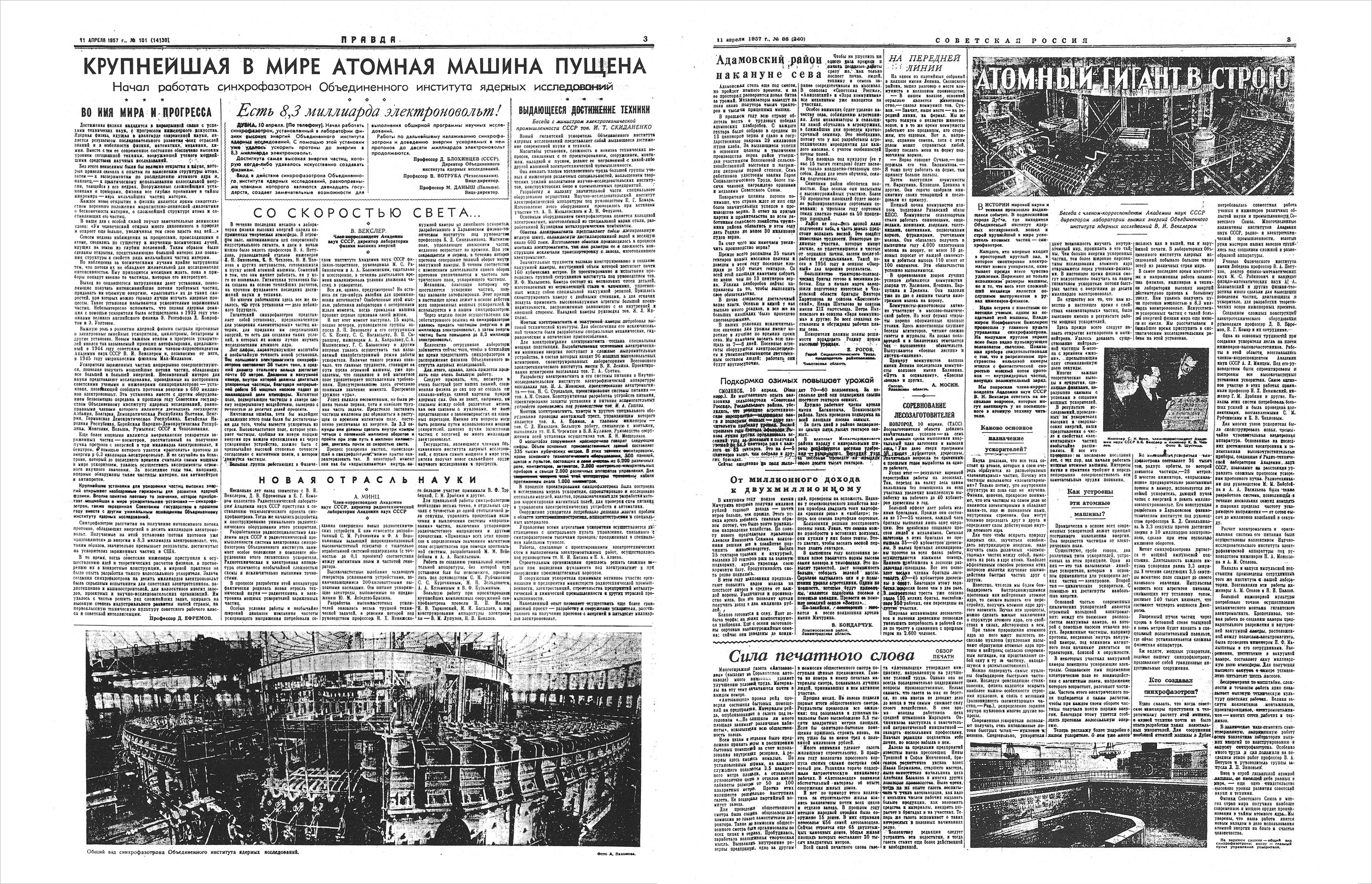 Об этом событии всему миру сообщила газета «Правда» 11 апреля 1957 года. Более поздняя дата обусловлена тем, что это известие появилось, лишь когда энергия ускорителя, постепенно поднимаемая со дня пуска, превысила энергию 6,3 ГэВ лидирующего в то время американского синхрофазотрона в Беркли. «Есть 8,3 миллиарда электронвольт!» — сообщала газета, извещая, что в Советском Союзе создан рекордный ускоритель.