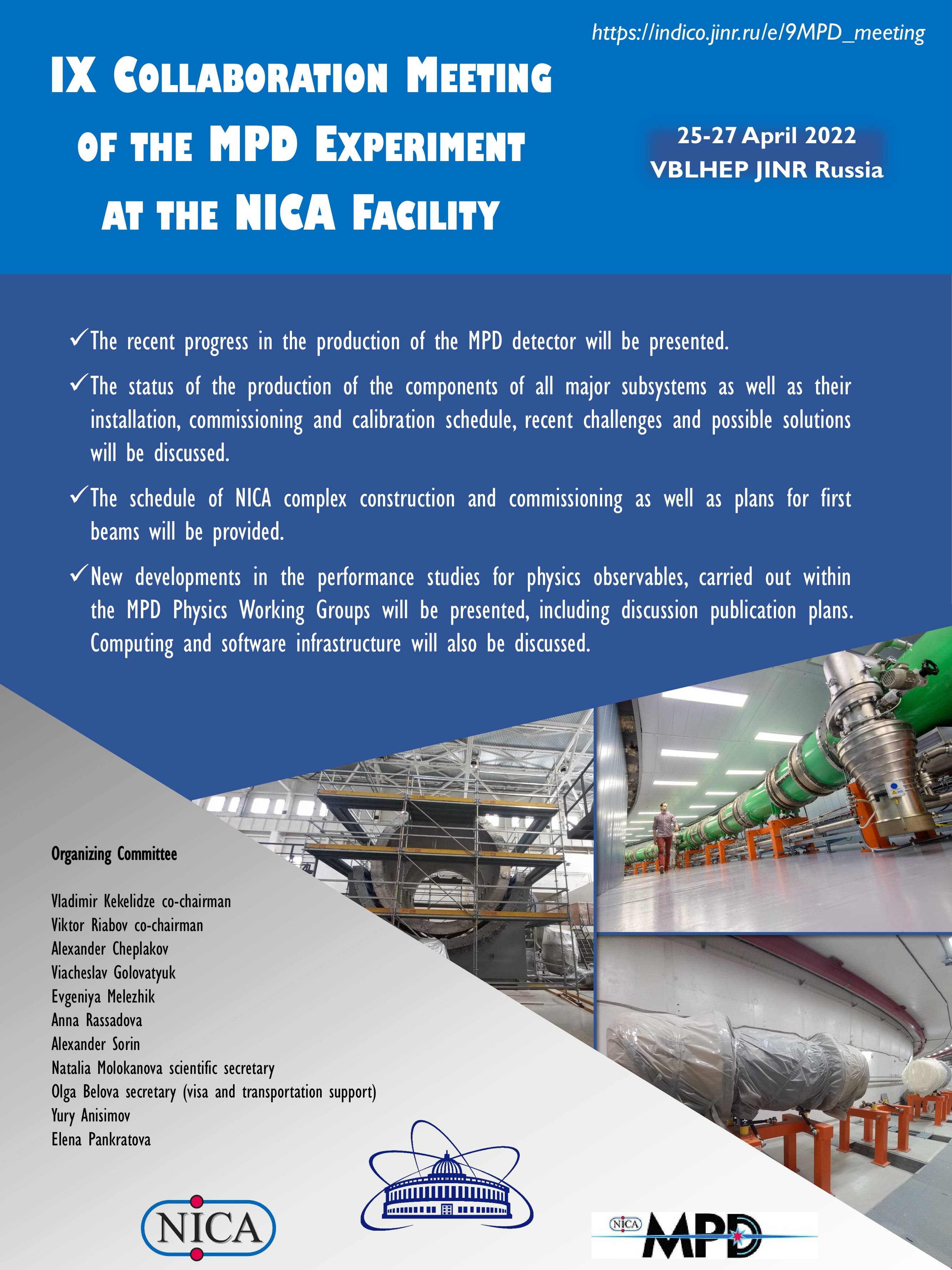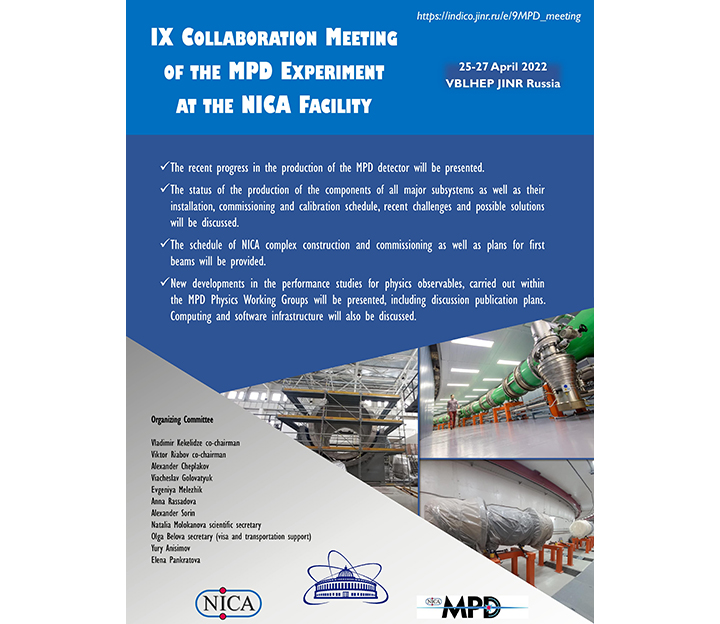 В понедельник, 25 апреля, стартует трехдневное совещание коллаборации MPD на комплексе NICA. Девятое по счету мероприятие пройдет в гибридном формате: онлайн и офлайн в Лаборатории физики высоких энергий ОИЯИ.