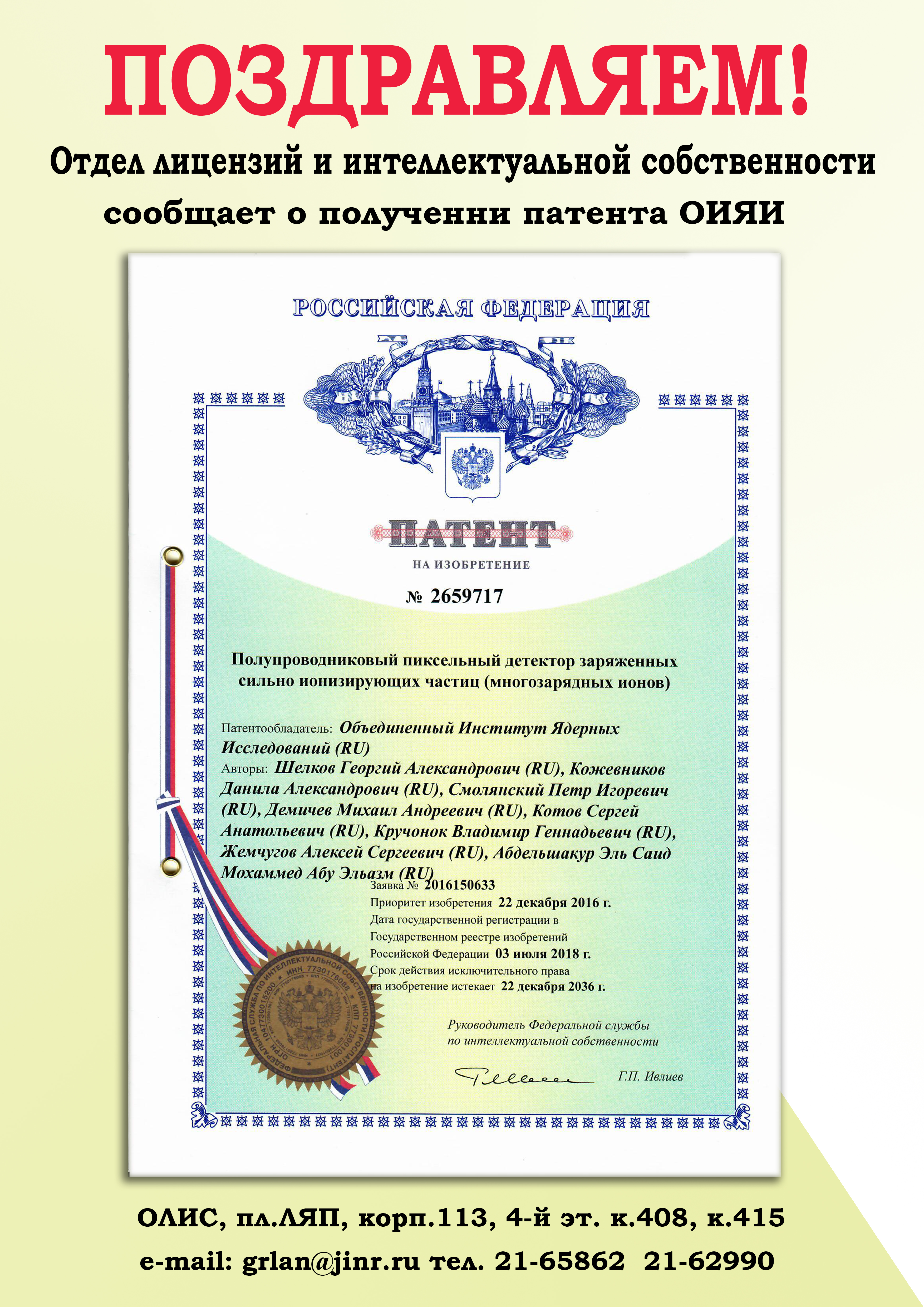 JINR staff congratulates the authors on receiving the patent for their invention!