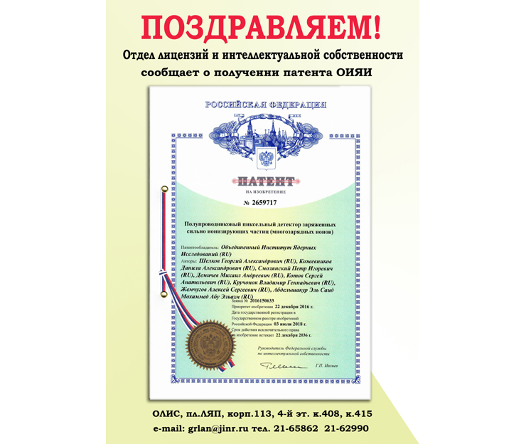 The Licensing and Intellectual Property Department of JINR announces that on 3 July 2018, the Joint Institute for Nuclear Research received a patent for the invention “Semiconductor pixel detector of charged strongly ionized particles (multicharged ions)”. The authors of the work are Shelkov Georgij Aleksandrovich, Kozhevnikov Danila Aleksandrovich, Smolyanskij Petr Igorevich, Demichev Mikhail Andreevich, Kotov Sergej Anatolevich, Kruchonok Vladimir Gennadevich, Zhemchugov Aleksej Sergeevich, Abdelshakur El Said Mokhammed Abu Elazm.