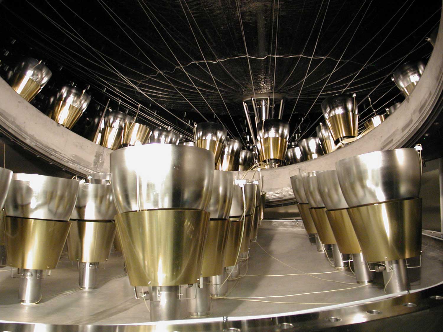 Photomultipliers of the Borexino detector on the inner side of the metallic sphere. A cone-shaped light concentrator is installed above each photomultiplier. The open part of the concentrator has a diameter of 50 cm. The yellow truncated cylinders protect the devices from the Earth’s magnetic field © Borexino Collaboration