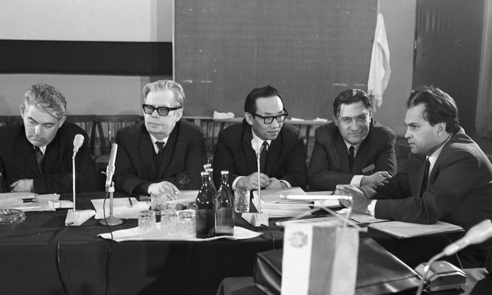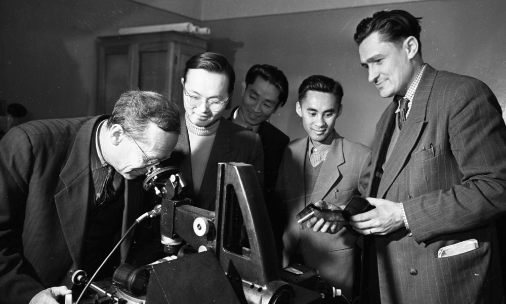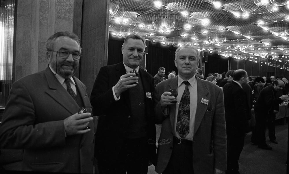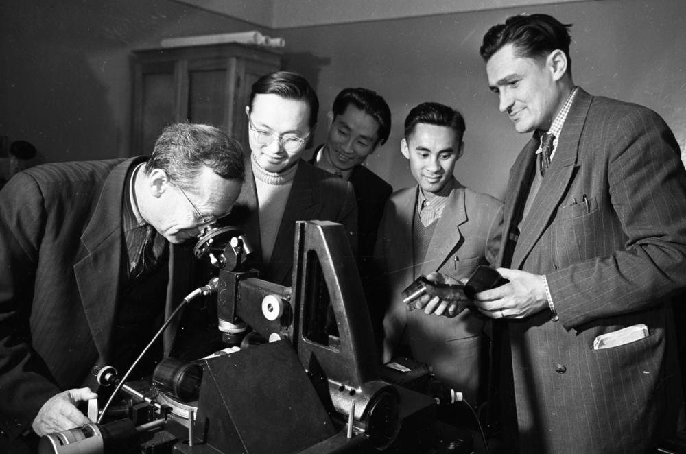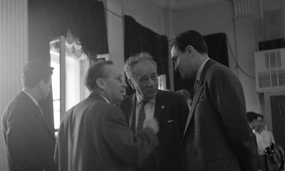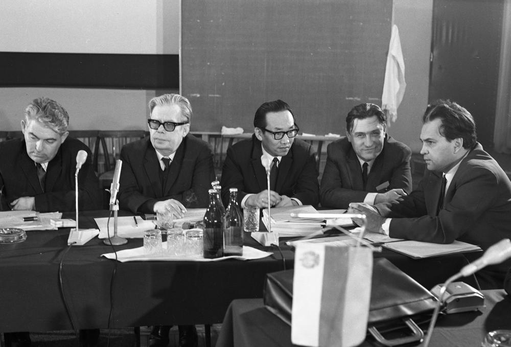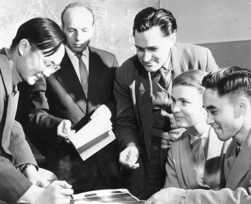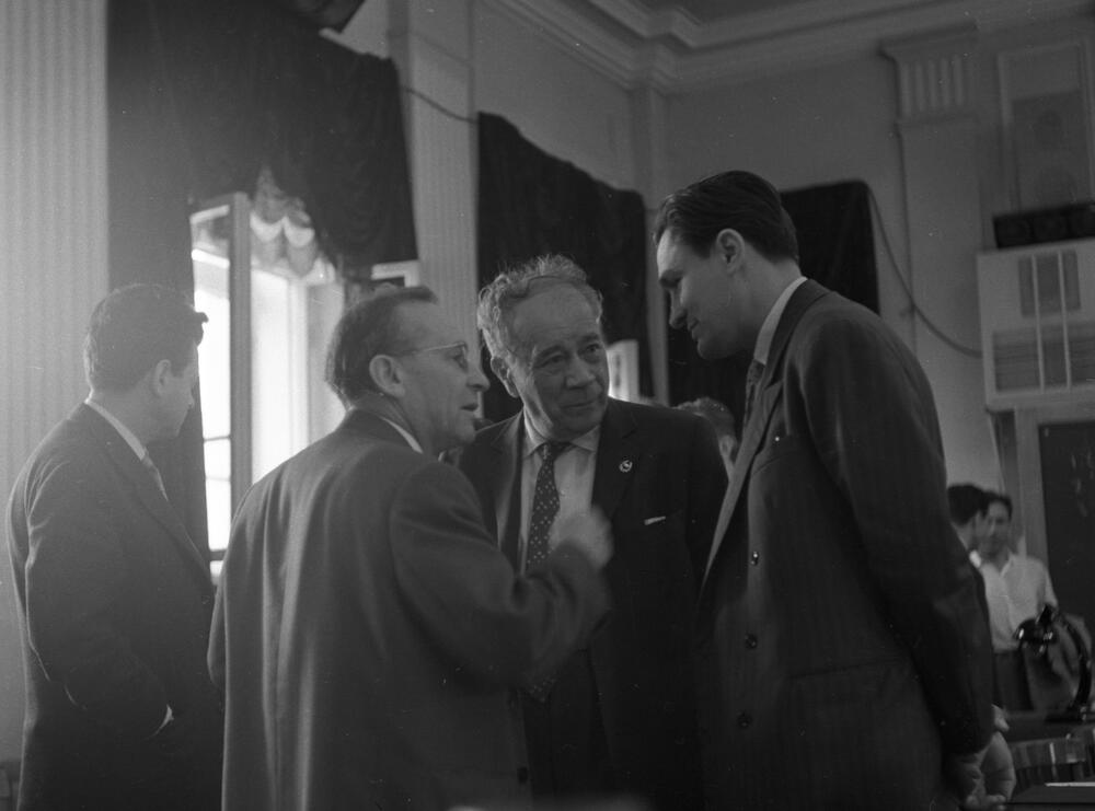 A group of discoverers of the anti-sigma-minus-hyperon particle at the JINR Synchrophasotron headed by Academician Veksler (on the left). Alexandru Mihul – the first on the right.