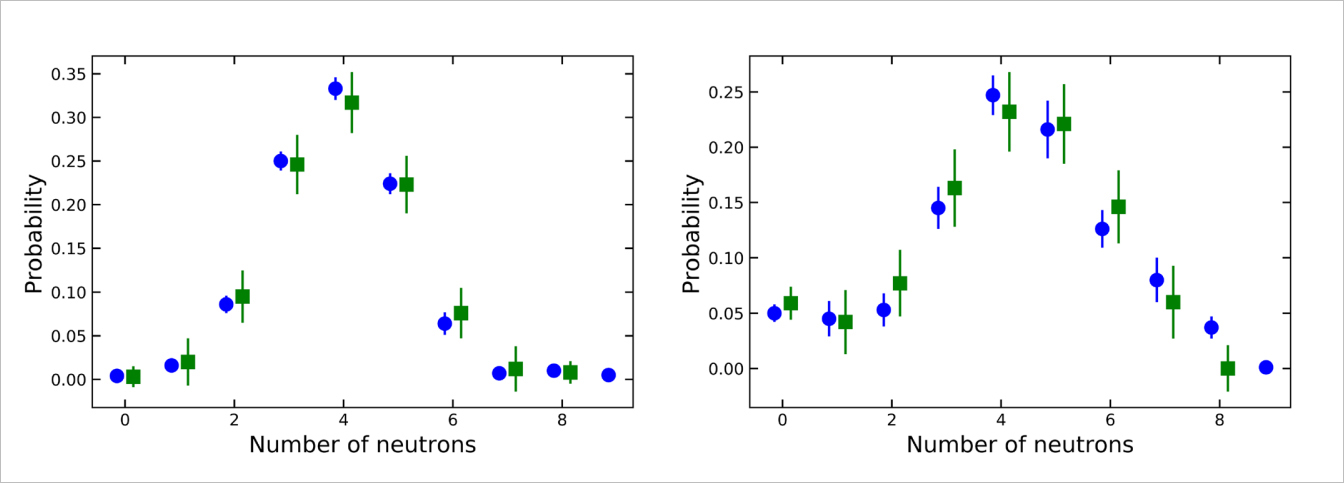 Comparison of restored prompt neutron multiplicity distributions of 254Fm (on the left graph) and 257Fm (on the right graph)