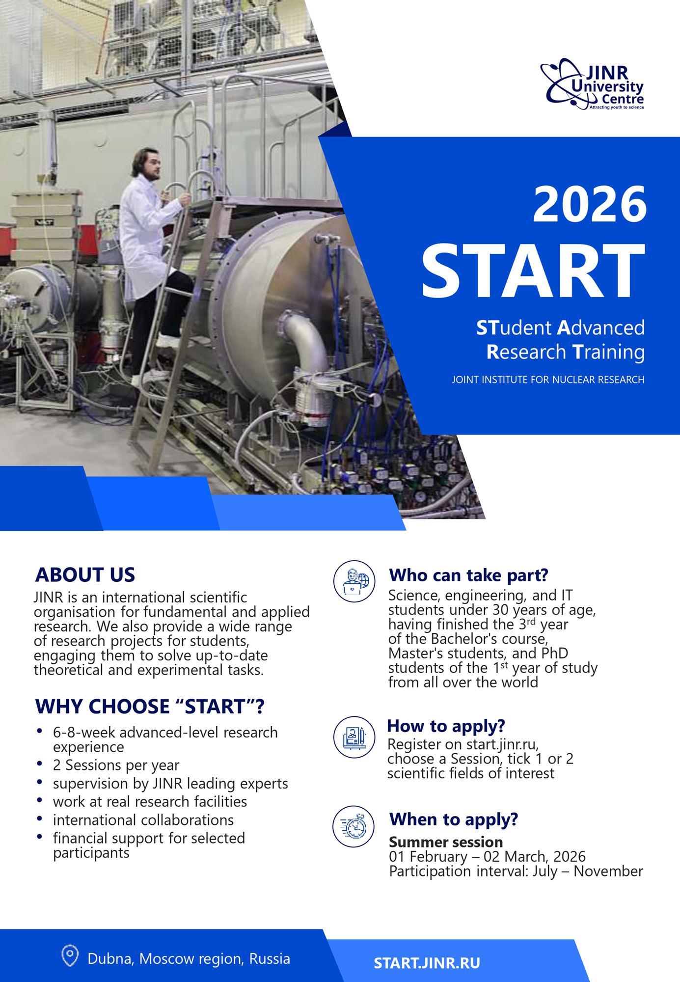 The START (STudent Advanced Research Training) programme invites students and postgraduates to join the JINR studies under the supervision of leading scientists and engineers. Applications for the 2026 summer session are accepted at start.jinr.ru from 1 February until 2 March 2026.