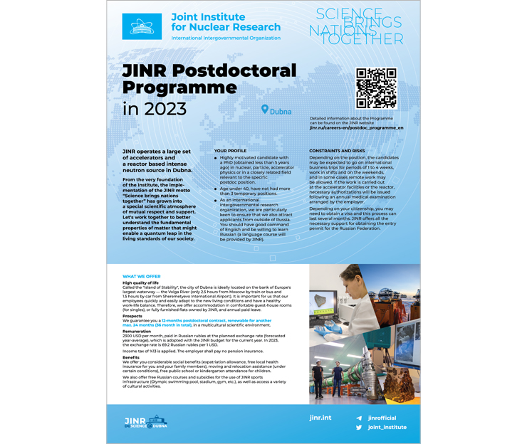 Applications for participation in the JINR Postdoctoral Programme are accepted from 1 October to 1 November 2023. The JINR Postdoctoral Programme is aimed at young scientists specialising in theoretical and experimental particle physics, nuclear physics, relativistic heavy ion physics, condensed matter physics, and radiobiology. The original appointment will be for 1 year, with the possibility to renew it for another 2 years.