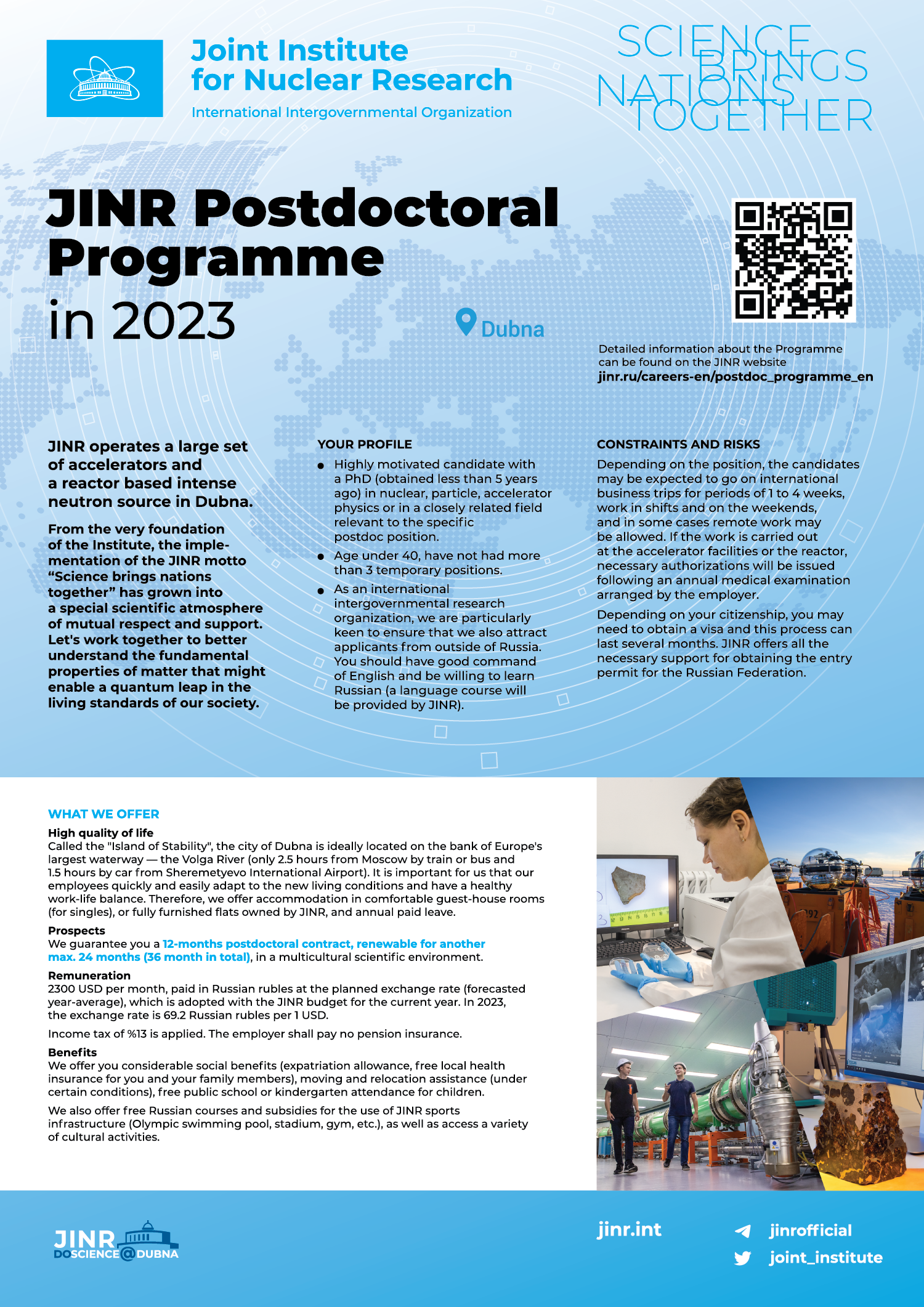 Applications for participation in the JINR Postdoctoral Programme are accepted from 1 October to 1 November 2023. The JINR Postdoctoral Programme is aimed at young scientists specialising in theoretical and experimental particle physics, nuclear physics, relativistic heavy ion physics, condensed matter physics, and radiobiology. The original appointment will be for 1 year, with the possibility to renew it for another 2 years.