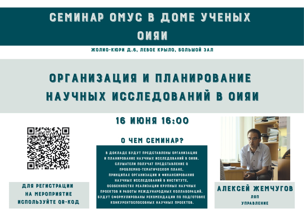 On 16 June 2022, Alexey Zhemchugov (DLNP, Institute Management) will make a presentation “Organization and planning of scientific research at JINR”. The speaker will present the organization and planning of scientific research at JINR. Participants will get an idea of the Topical Plan, organization principles and financing of scientific research at the Institute, implementation features of major scientific projects and the work of international collaborations. Recommendations for the preparation of competitive scientific projects will be formulated.