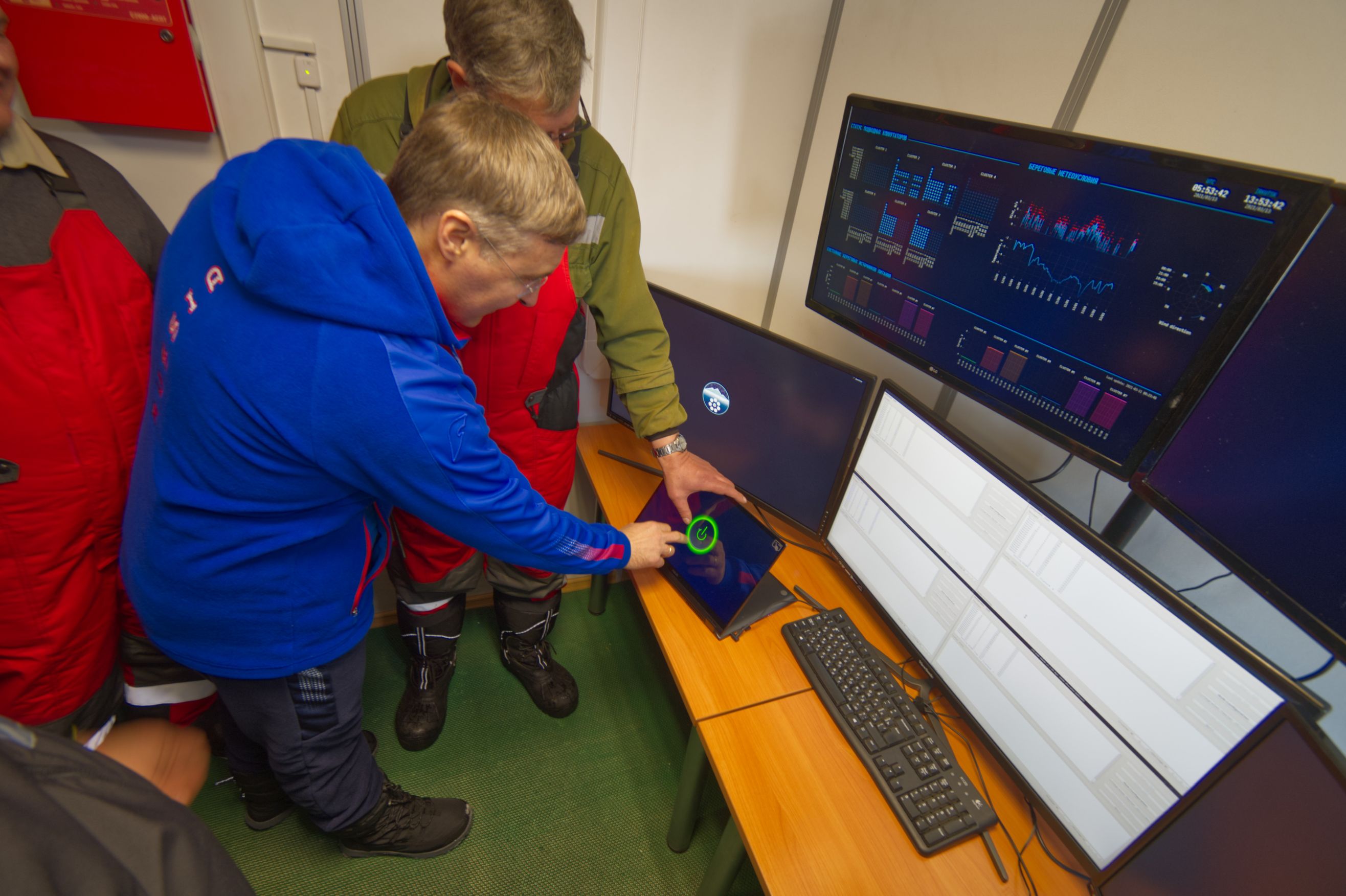 Minister of Science and Higher Education of Russia Valery Falkov Valery Falkov is pushing a button to launch the Baikal-GVD neutrino telescope. Photo by Bair Shaibonov / JINR