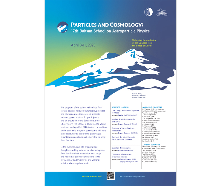 From 3 to 11 April 2025, the 17th “Particles and Cosmology” Baksan International School of Astrophysics will take place in the Prielbrusye National Park. The organizers are the Institute for Nuclear Research of the Russian Academy of Sciences (INR RAS) and the Joint Institute for Nuclear Research.