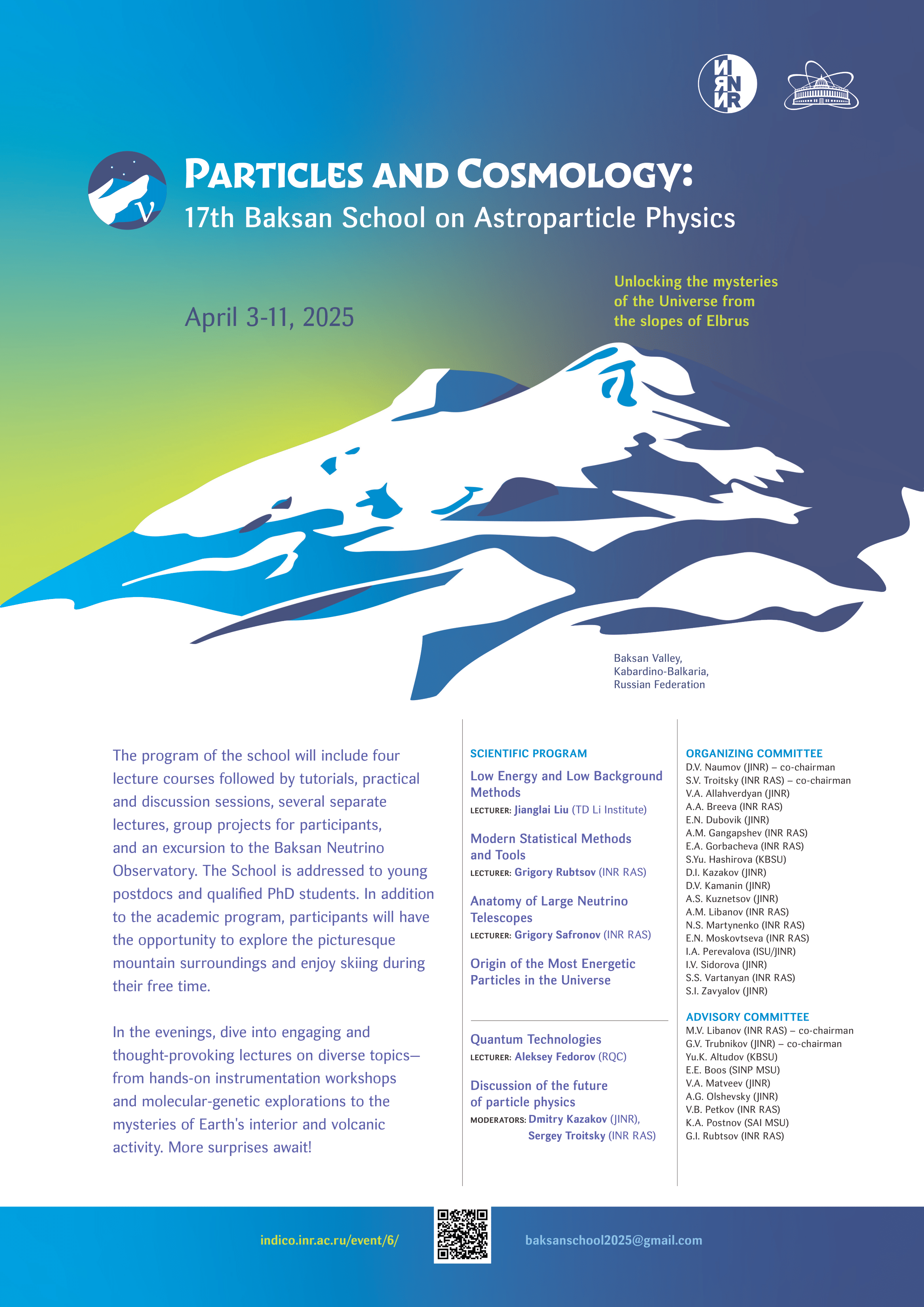 In addition, the participants will engage in practical classes and additional lectures, along with a guided tour and seminars at the Baksan Neutrino Observatory.