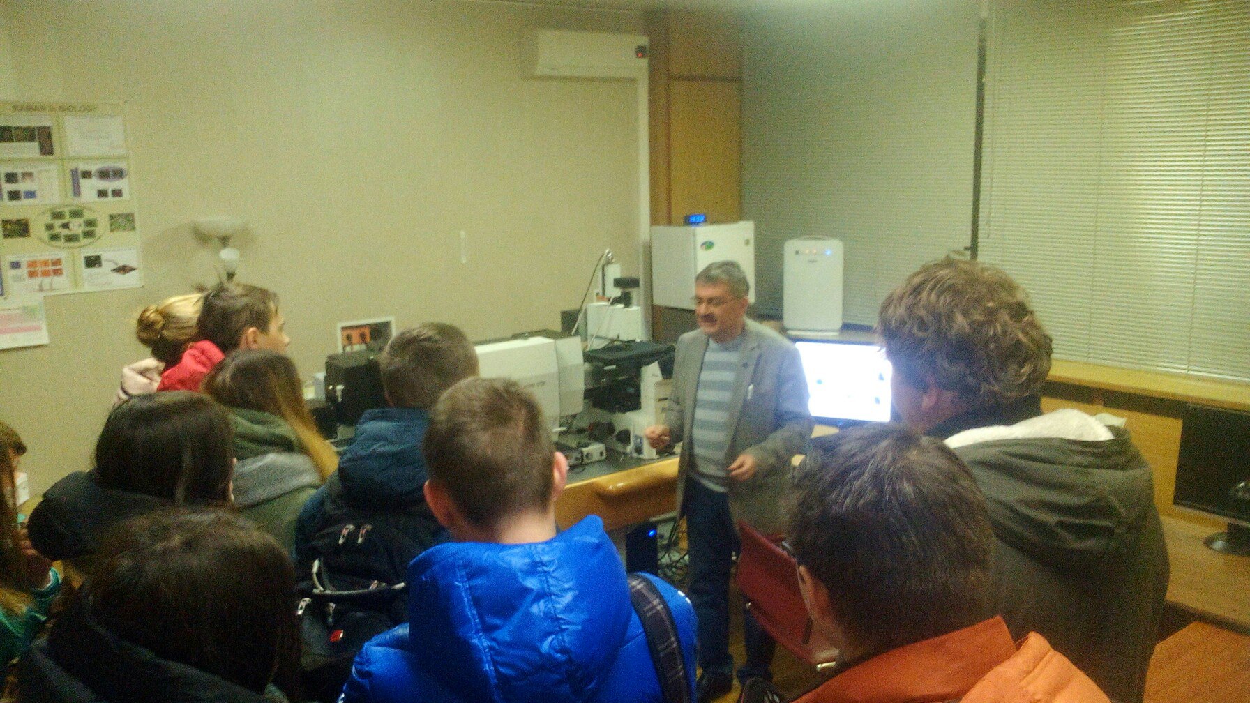 Заведующий кафедрой биофизики и директор Лаборатории радиационной биологии член-корреспондент РАН Е.А. Красавин рассказал ребятам об основных направлениях деятельности Лаборатории и предоставил возможность подискутировать на тему пилотируемых полетов в дальний космос. После этого школьники смогли увидеть где и как делается современная наука. Подержали в руках настоящий метеорит, увидели под микроскопом живые клетки, посчитали количество хромосом на метафазных пластинках и сравнили треки от тяжелых заряженных частиц и гамма-излучения в ядрах клеток лимфоцитов.