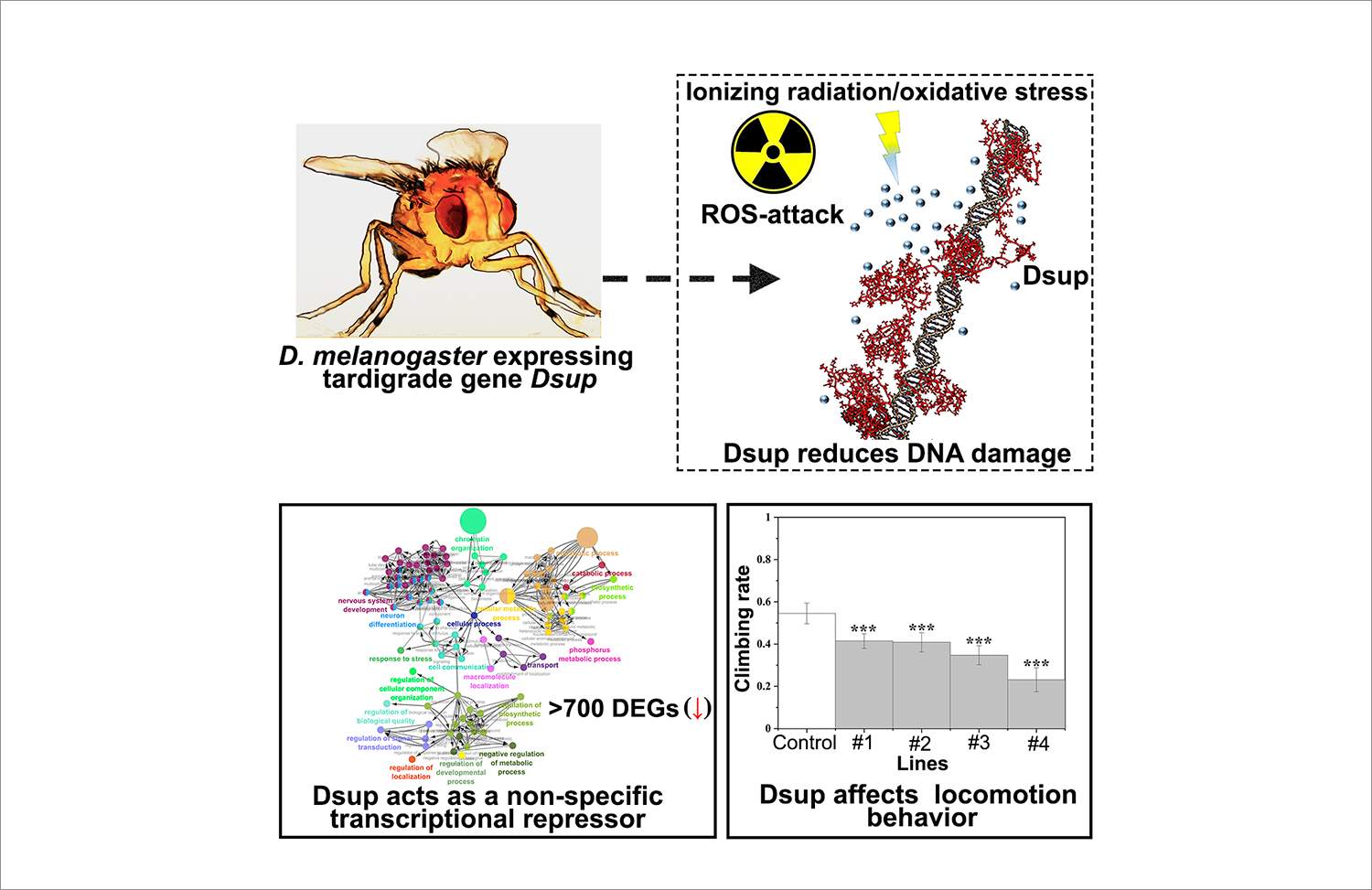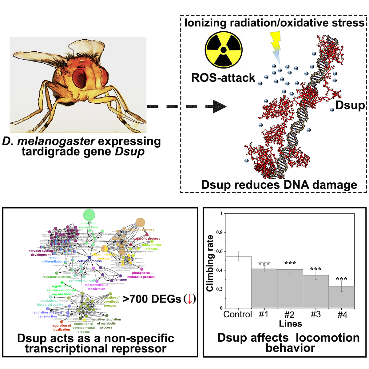Эксперименты биологов ОИЯИ показали, что генетическая вставка белка Dsup обеспечивает значительное увеличение выживаемости сложного модельного организма D.melanogaster после воздействия гамма-излучения в дозах 500-1000 Gy и оксидативного стресса. Ранее другая группа исследователей предположила, что белок Dsup создает защитную оболочку вокруг ДНК, принимая на себя часть радиационного удара, что приводит к большей сохранности ДНК и увеличивает выживаемость. Проводимые в ЛЯП ОИЯИ работы подтверждают эту гипотезу. Анализ активности всех генов (транскриптомный анализ) и физиологические тесты выявили влияние белка Dsup на ряд процессов в D.melanogaster, в частности, мушки стали хуже преодолевать длинные дистанции, что ученые связывают с некоторым замедлением клеточных процессов, связанных с ДНК и РНК, в присутствии белка Dsup.