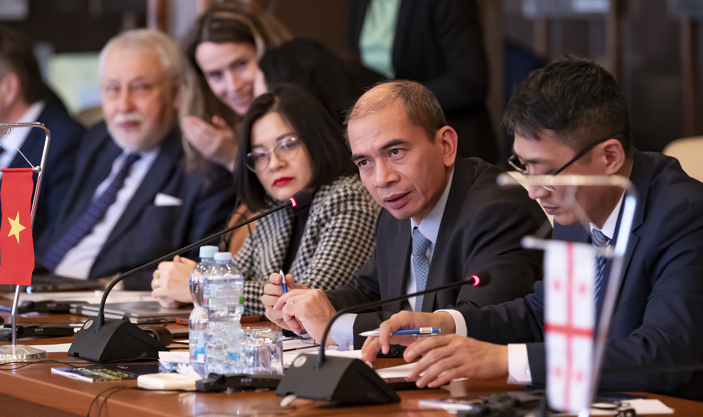 On 24 March, a session of the Committee of Plenipotentiaries (CP) of the Governments of the JINR Member States chaired by Plenipotentiary Representative of the Government of the Republic of Georgia in JINR Arsen Khvedelidze was held. The participants discussed the status of JINR research projects, the results achieved, and further plans for the development of the Institute. The Committee members studied the latest version of the draft of the new Seven-Year Plan for the Development of JINR for 2024 – 2030. Deputy Director General, Head of the Nuclear Energy Department of the International Atomic Energy Agency (IAEA) Mikhail Chudakov and a representative of the Embassy of Mexico in the Russian Federation Ana Isabel Lopez Estrada took part in the session as honoured guests. Head of the Directorate for Scientific Affairs of the Arab Atomic Energy Agency (AAEA) Daw Saad Mosbah Khalefa attended the meeting. Director of the Vinča Institute of Nuclear Sciences Snežana Pajović and Senior Assistant of the Ministry of Science, Technological Development and Innovation of Serbia Svetlana Bogdanović joined the CP meeting on behalf of the Republic of Serbia.