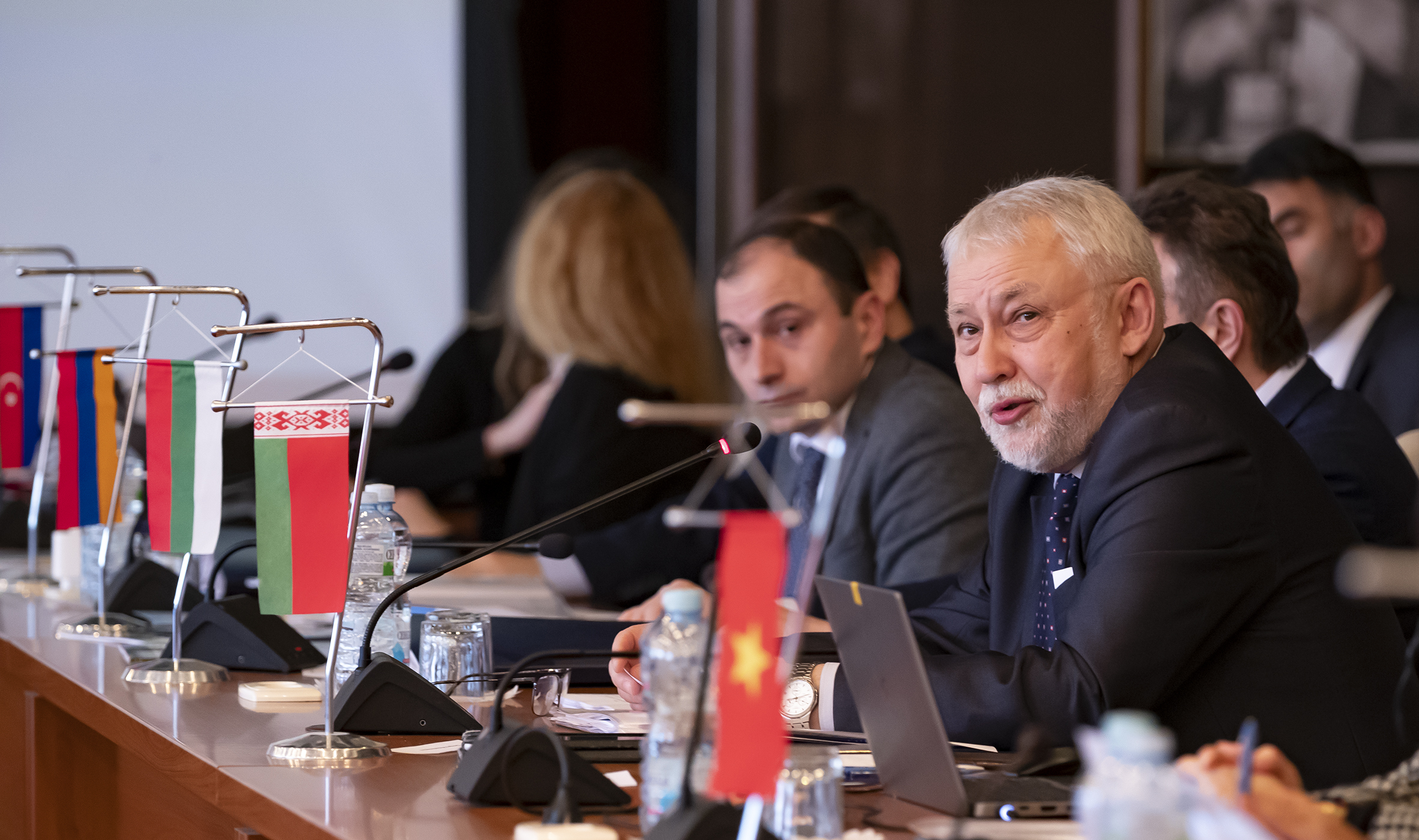 On 24 March, a session of the Committee of Plenipotentiaries (CP) of the Governments of the JINR Member States chaired by Plenipotentiary Representative of the Government of the Republic of Georgia in JINR Arsen Khvedelidze was held. The participants discussed the status of JINR research projects, the results achieved, and further plans for the development of the Institute. The Committee members studied the latest version of the draft of the new Seven-Year Plan for the Development of JINR for 2024 – 2030. Deputy Director General, Head of the Nuclear Energy Department of the International Atomic Energy Agency (IAEA) Mikhail Chudakov and a representative of the Embassy of Mexico in the Russian Federation Ana Isabel Lopez Estrada took part in the session as honoured guests. Head of the Directorate for Scientific Affairs of the Arab Atomic Energy Agency (AAEA) Daw Saad Mosbah Khalefa attended the meeting. Director of the Vinča Institute of Nuclear Sciences Snežana Pajović and Senior Assistant of the Ministry of Science, Technological Development and Innovation of Serbia Svetlana Bogdanović joined the CP meeting on behalf of the Republic of Serbia.