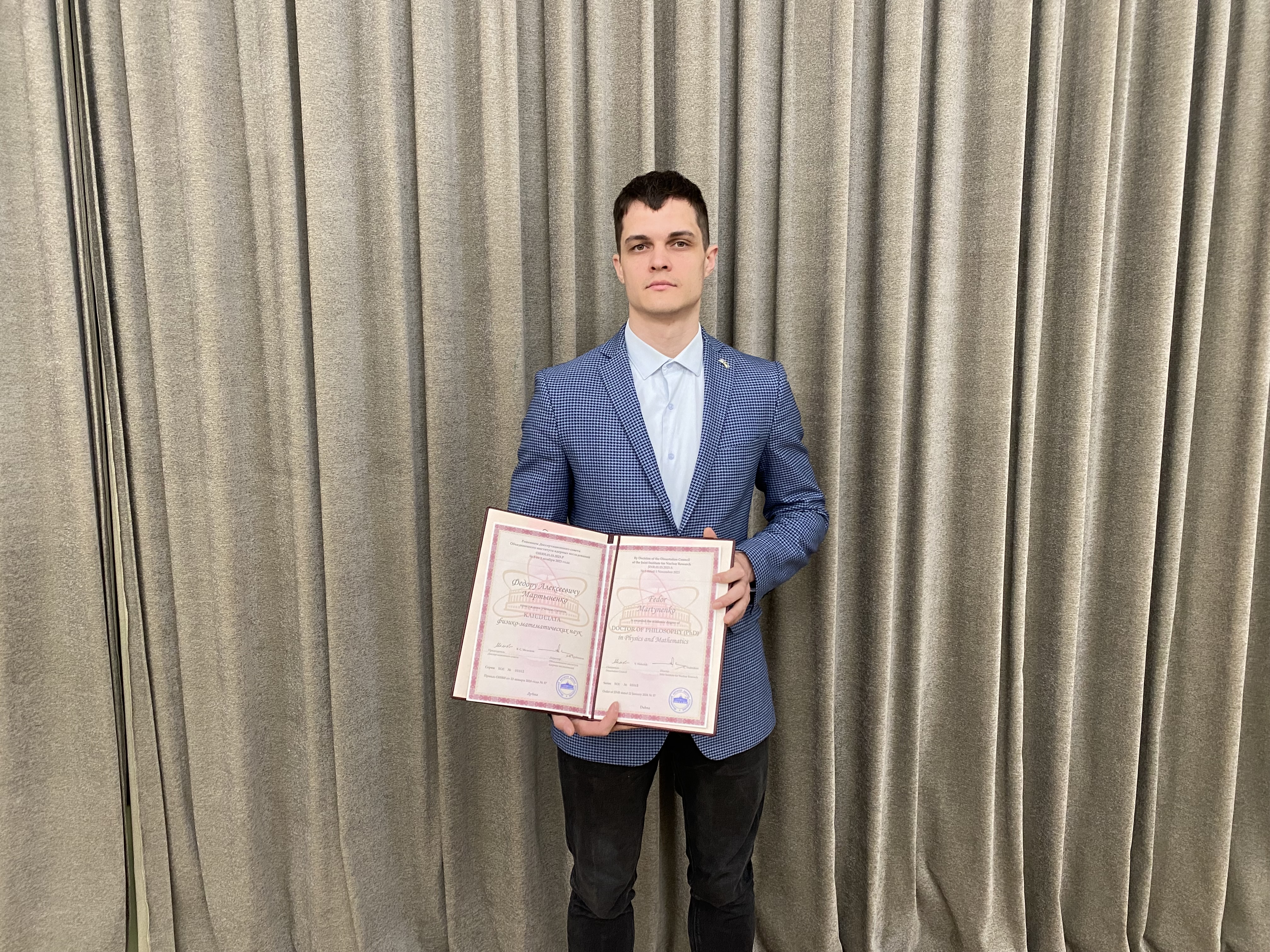 Andrey O. Gridin (Russian Federation) was awarded the academic degree of Candidate of Physical and Mathematical Sciences based on the results of defending his thesis on the topic “Investigation of the production of J/psi pairs in the COMPASS experiment” in the specialty 1.3.15: “Physics of atomic nuclei and elementary particles, high energy physics”. The defense was held at the Dissertation Council on Nuclear Physics at DLNP.