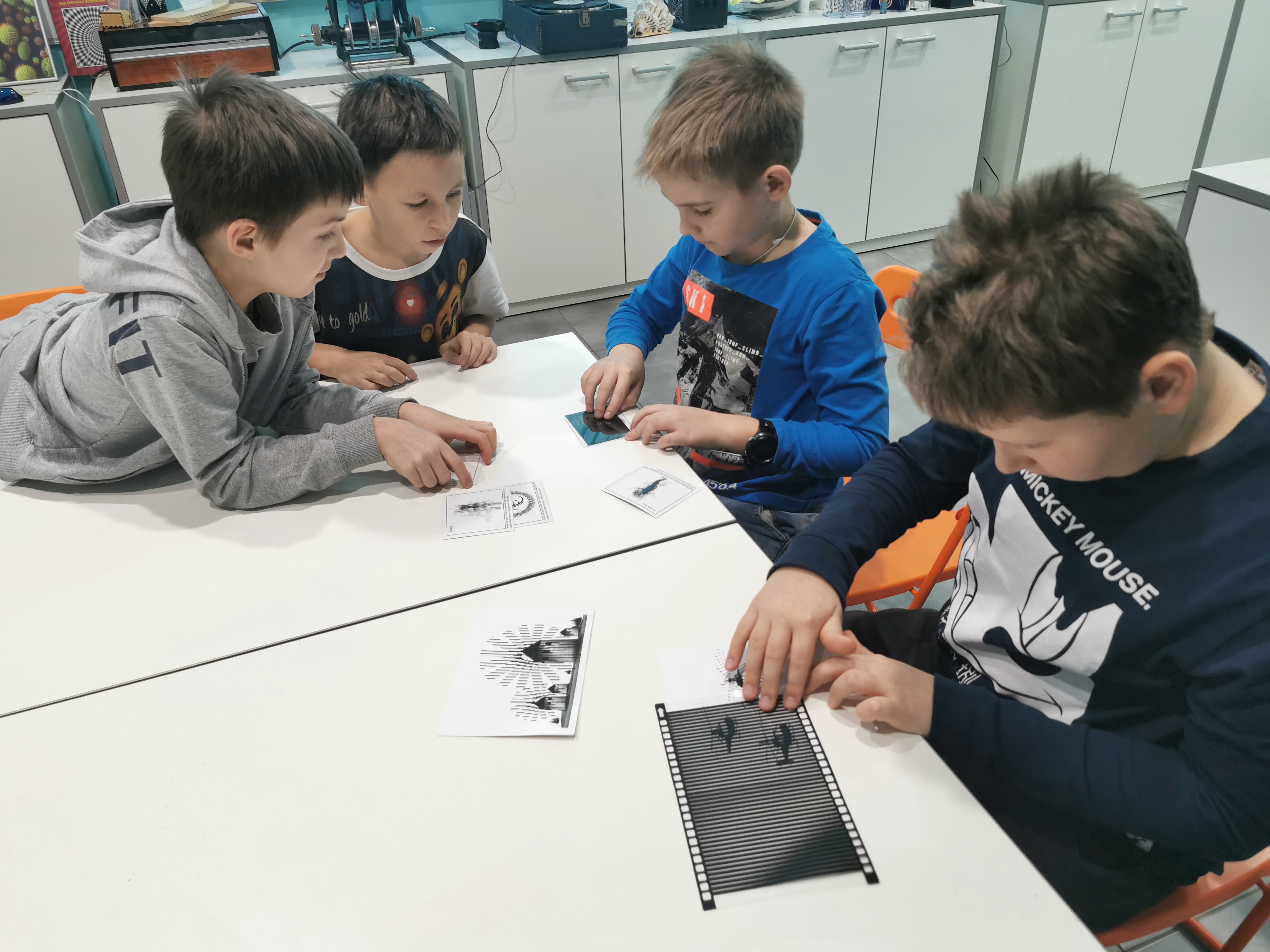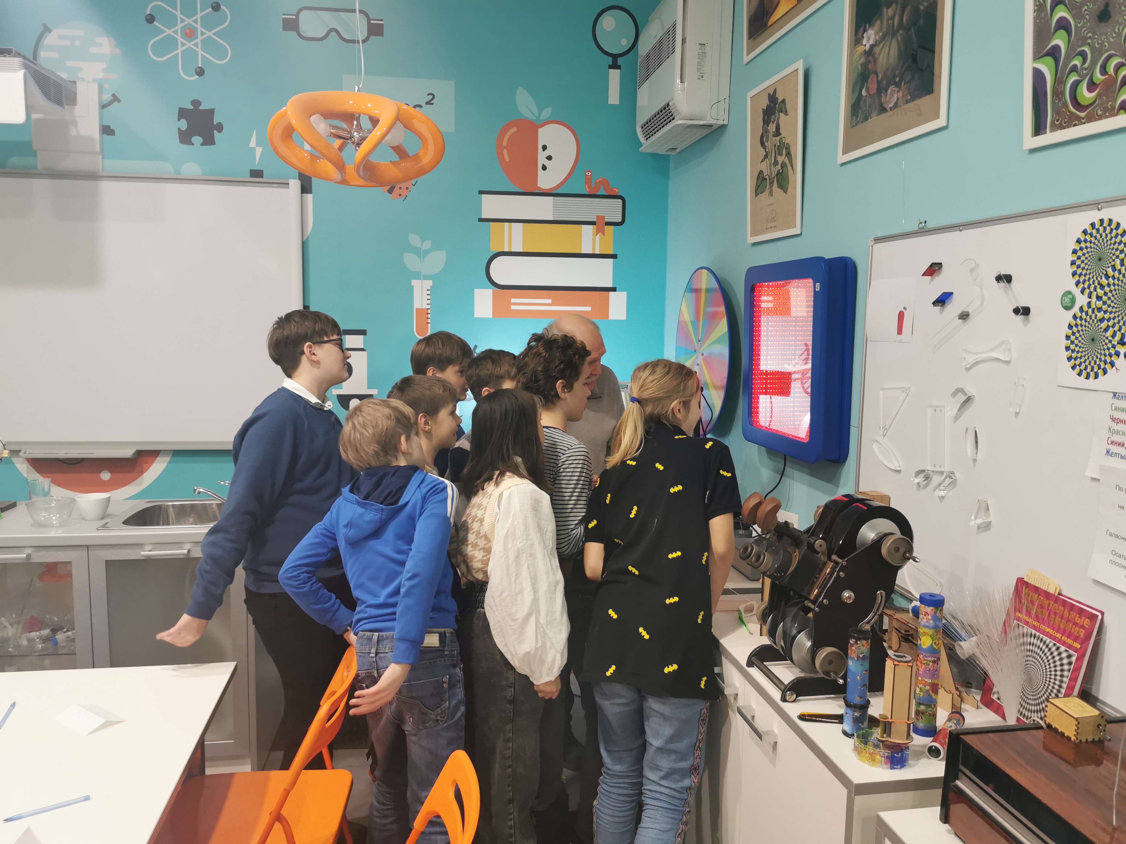 The project started with optics according to the organizers’ decision. To date, there are various optical instruments in the Museum. They can demonstrate the most unexpected effects. The first lesson started with an explanation of what an optical instrument is, which optical instruments surround us in everyday life. Then, during the course of lessons, explanations and demonstrations of experiments will be presented from simple to complicated, from ordinary to unusual, from unusual to extraordinary. School students will be looking for answers to various questions. Is it possible to see half of yourself and half of your friend in the mirror? Is it possible using a system of mirrors to pierce a 10-ruble coin with your finger? What is the difference between an eye of a dragonfly and an eye of a person? What is a demonstration telescope? It is a simplified telescope in the section so to say. With its help, we can reproduce a well-known experiment of Newton on the decomposition of white light into a rainbow spectrum. And how are cartoons created? There are tools for animation in the Classrom Laboratory. For example, a manual praxinoscope, a multi projector on gears, sets for raster animation.