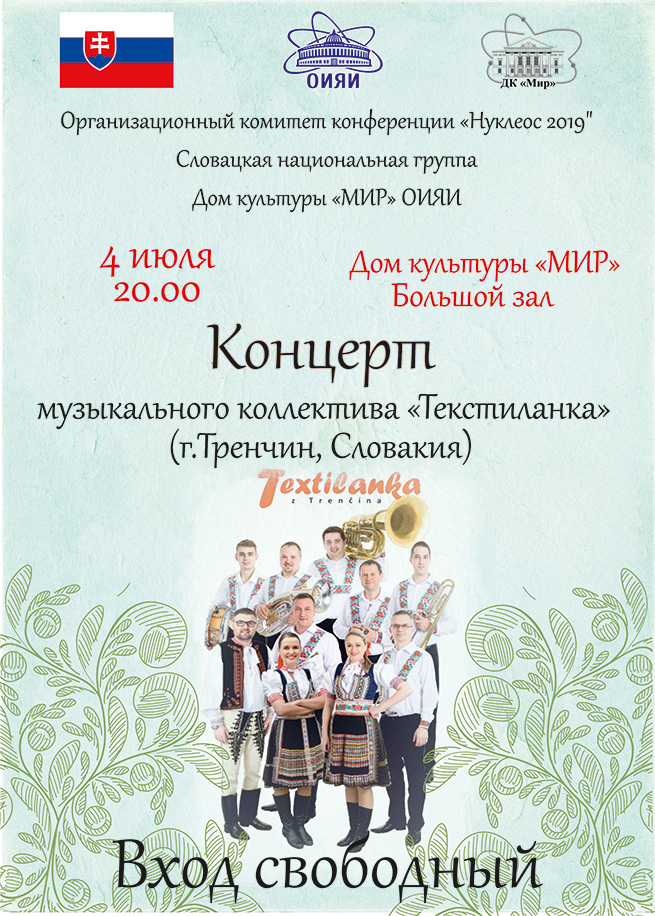 Representatives of the JINR Association of Fellow-Countrymen invite you to the Slovak evening on Saturday, 06.07.2019, cafe “Stulia” at the address: Popova str., 7B, Dubna. The event will start at 5 PM. At the party, you can listen to the performance of the Slovak musical group “Tekstilanka” and order an authentic Czech goulash.
