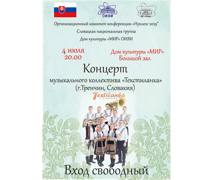 On 4 July 2019, at 8:00 PM, JINR Cultural Centre “Mir” ivites to the big concert hall to enjoy the concert of the “Textilanka” music band from Slovakia. Free admission.
