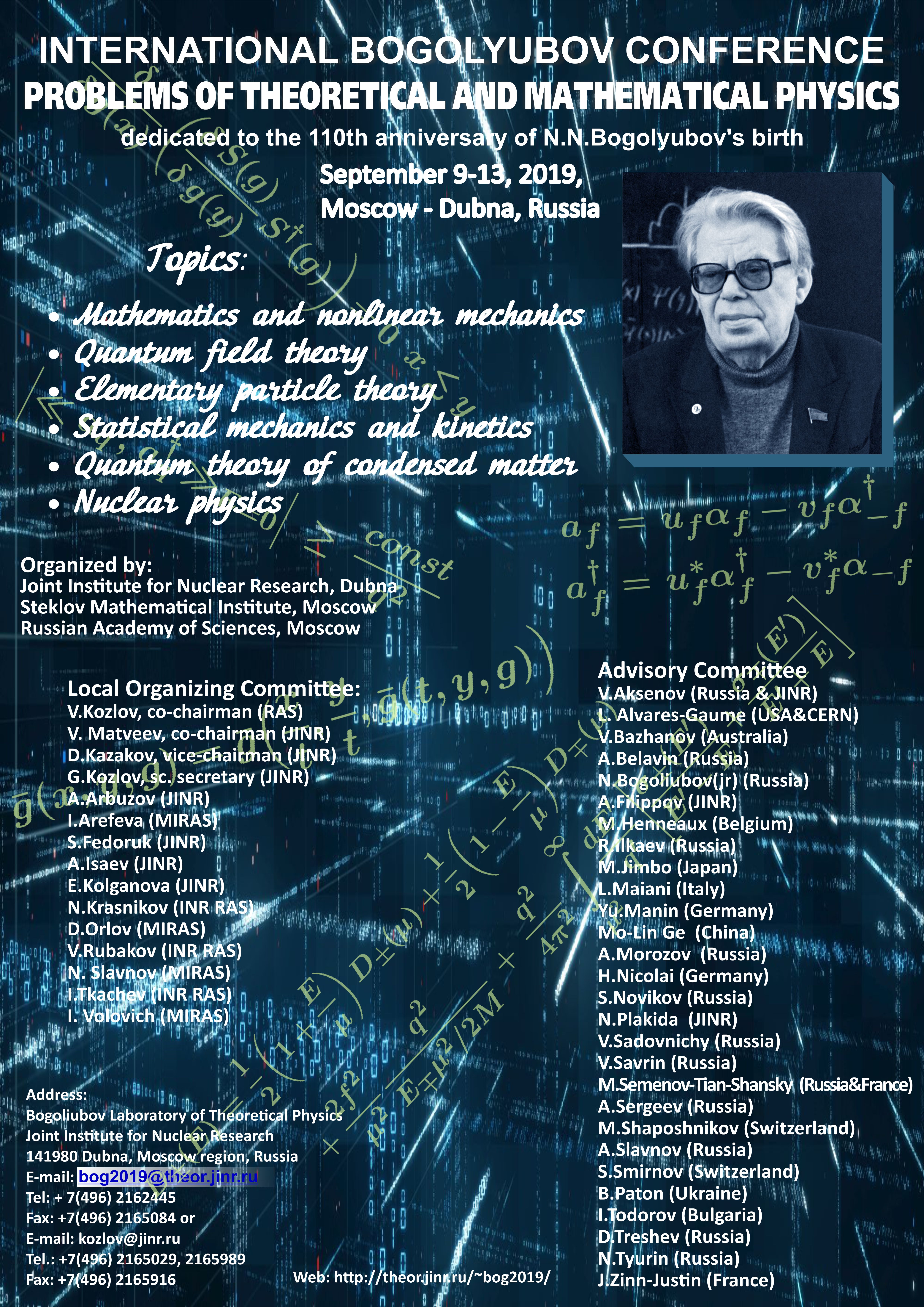 The International Bogoliubov Conference “Problems of Theoretical and Mathematical Physics” will be held from 11 September to 13 September 2019 in Dubna, in the Bogoliubov Laboratory of Theoretical Physics JINR. The first part of the Bogoliubov Conference-2019 is held from 9 September to 10 September 2019 in Moscow in the Steklov Mathematical Institute RAS.