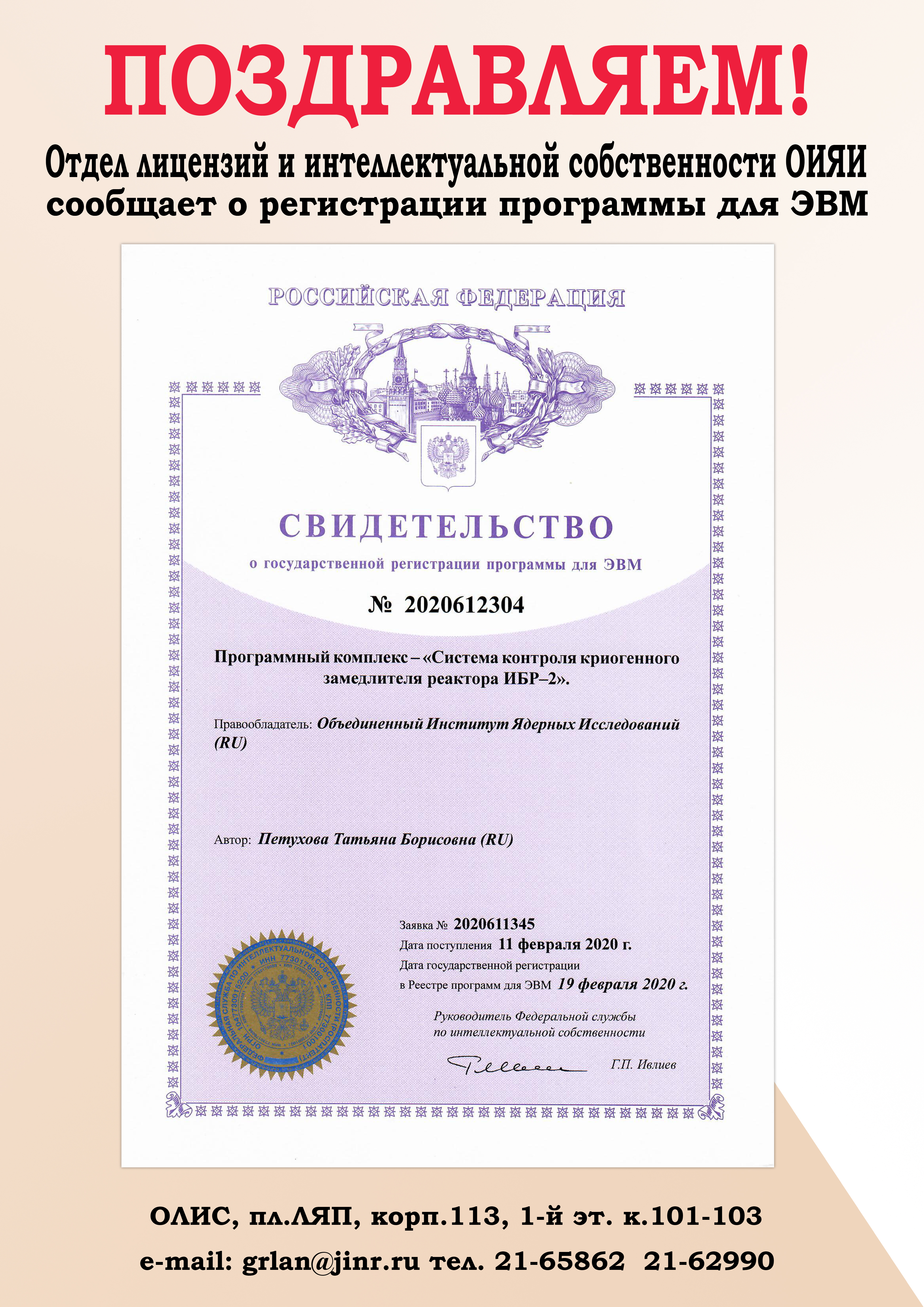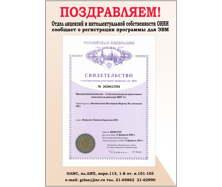 The Licensing and Intellectual Property Department of JINR announces that on 19 February 2020, the Joint Institute for Nuclear Research received a certificate of state registration of the software complex “Control system of the cryogenic moderator of the IBR-2 reactor”. The author of the work is Tatiana B. Petukhova.