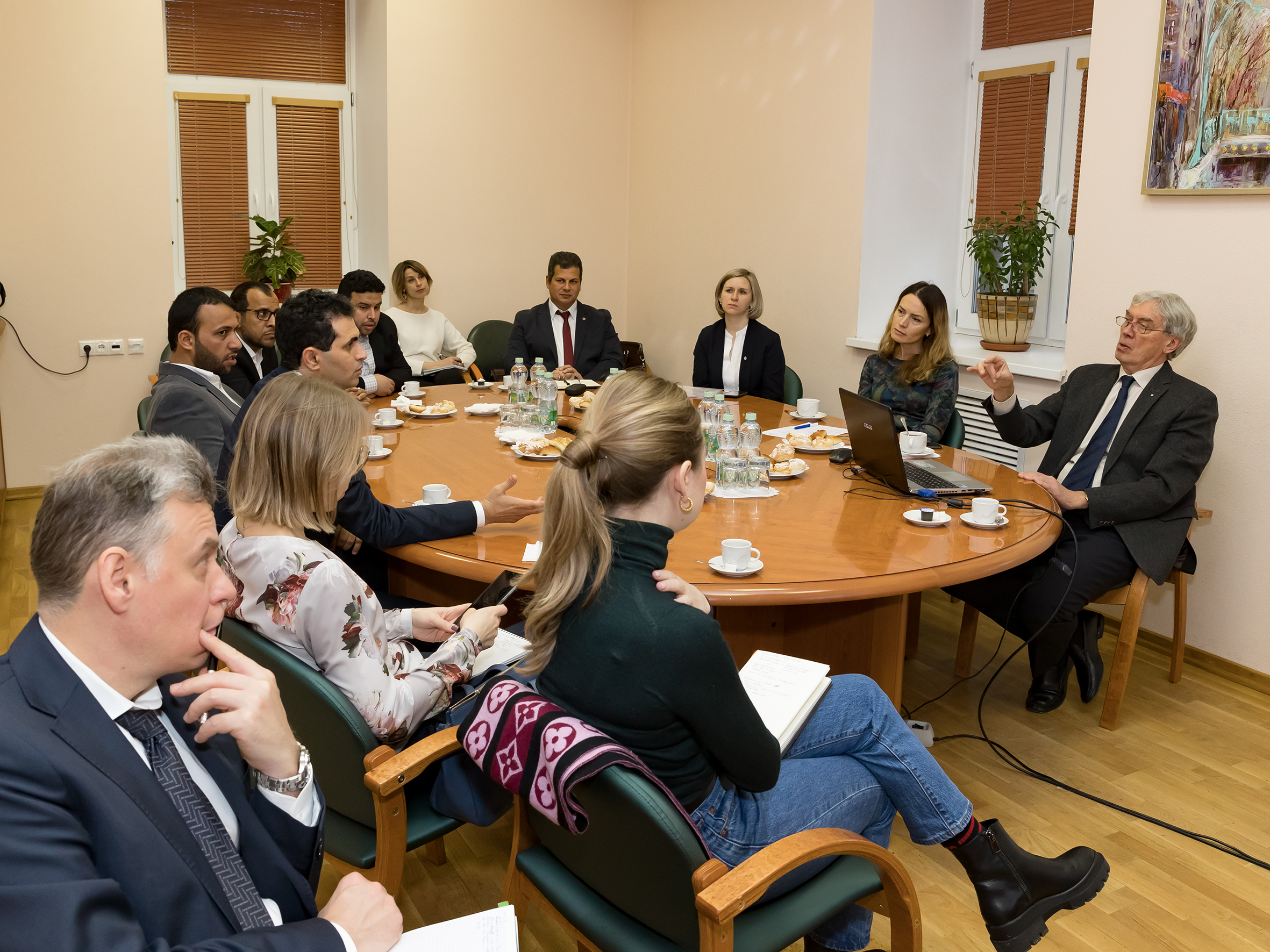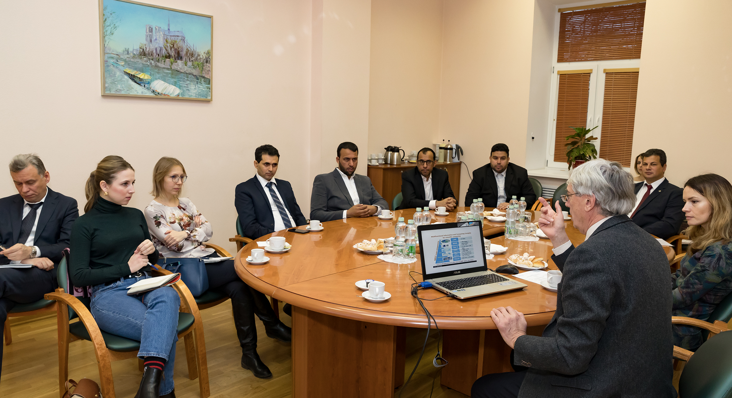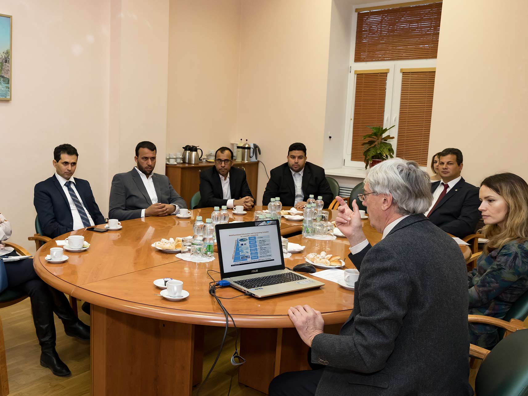 В Дирекции ОИЯИ делегацию приветствовал вице-директор ОИЯИ академик Борис Шарков, открывший встречу обзорным рассказом о направлениях научной деятельности Института. Со стороны ОИЯИ во встрече также принимали участие заместитель начальника Отдела международных связей ОИЯИ Анна Котова и руководитель группы египетских сотрудников в ОИЯИ и ответственный по связям ОИЯИ с Арабским агентством по атомной энергии Ваел Бадави, представивший гостям опыт АРЕ по участию в научной деятельности ОИЯИ. В своем ответном слове глава делегации Султан аль-Сагаби отметил, что визит делегации носит ознакомительный характер и имеет своей целью поиск возможностей для сотрудничества в различных областях ядерной физики и ускорительных технологий, а также в сфере подготовки высококвалифицированных кадров на базе ОИЯИ.