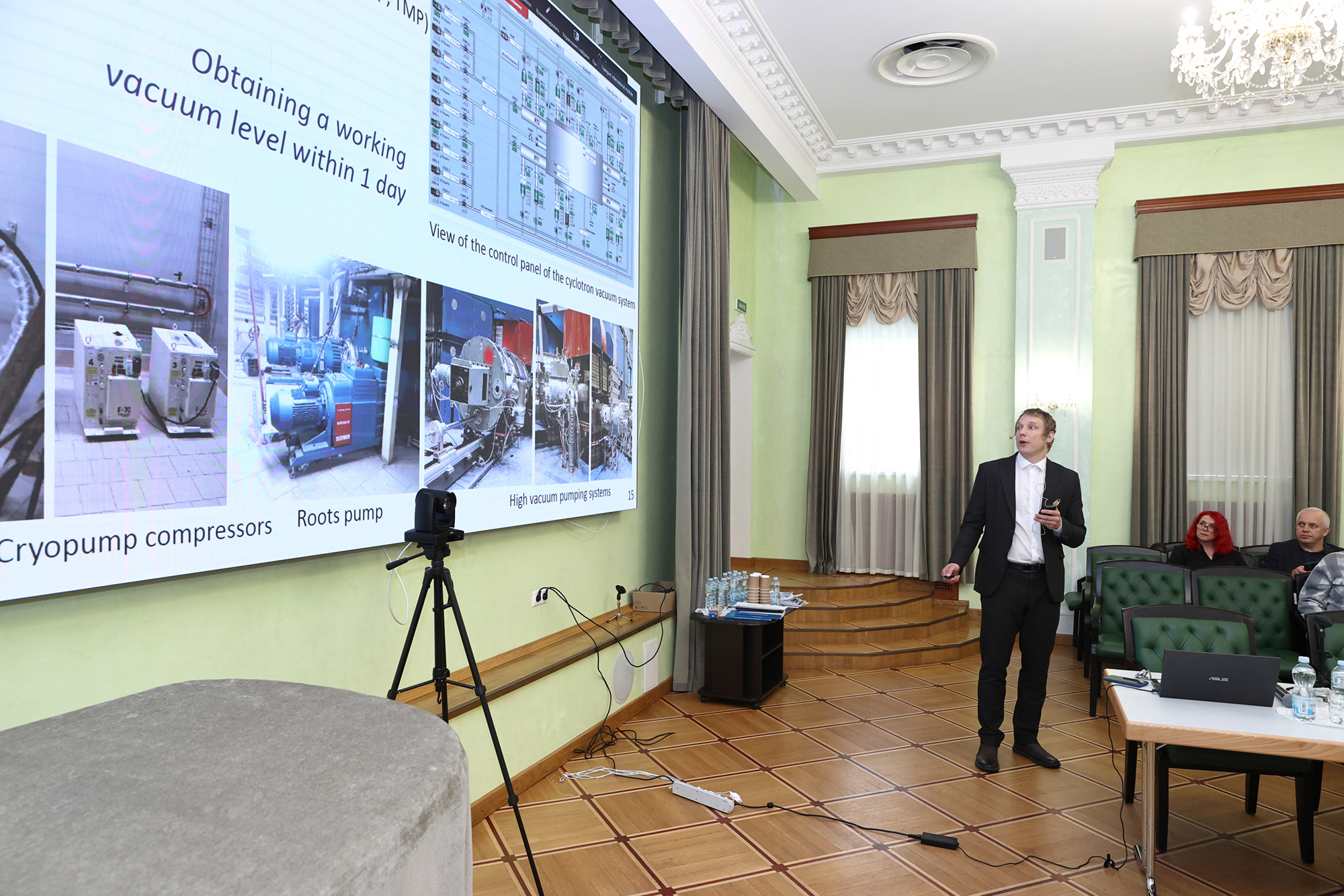 Head of the FLNR JINR Scientific and Technological Accelerator Department Vasily Semin reported on the status of the U-400M Accelerator. As part of the development of the FLNR Accelerator Complex (DRIBS-III Project), the modernisation of the U-400M Facility began in July 2020. Its main goal was to increase the reliability and stability of the accelerator’s operations (with the main magnet coils, the accelerator vacuum system components, the control system, and the radiation monitoring system replaced to achieve this) and the intensity and energy of heavy-ion beams.