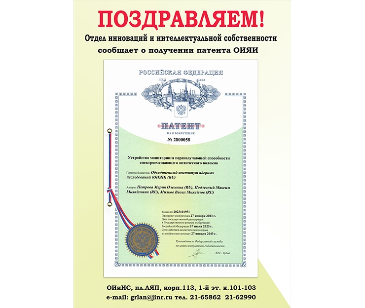 On July 17, 2023, the Joint Institute for Nuclear Research was granted a patent for invention No.2800058 “Device for controlling the transmitting capacity of wavelength-shifting optical fibers”. The authors are employees of FLNP JINR Maria Petrova, Maxim Podlesnyy and Vasil Milkov.