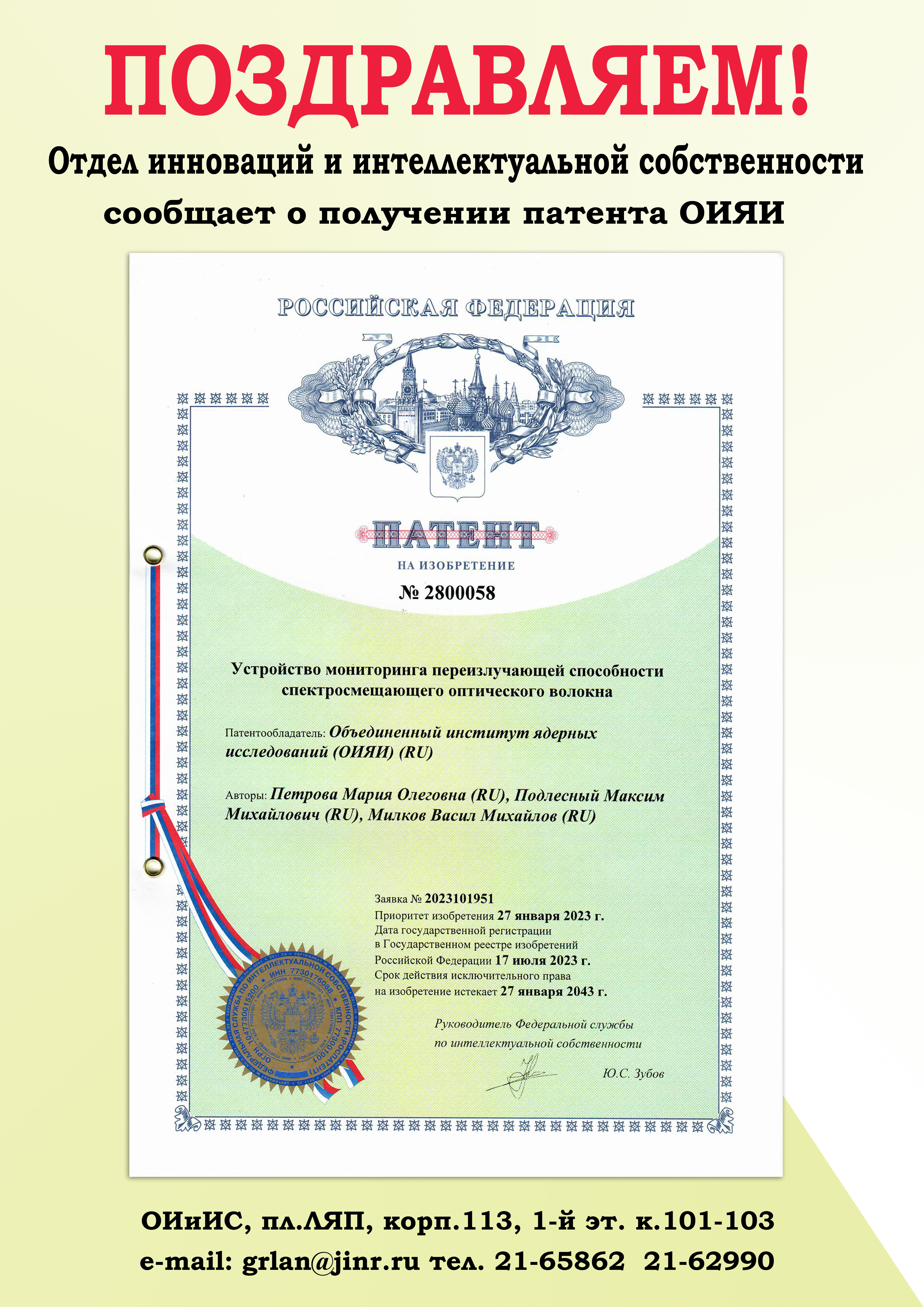On July 17, 2023, the Joint Institute for Nuclear Research was granted a patent for invention No.2800058 “Device for controlling the transmitting capacity of wavelength-shifting optical fibers”. The authors are employees of FLNP JINR Maria Petrova, Maxim Podlesnyy and Vasil Milkov.