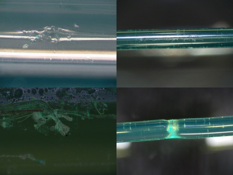 Fig. 1. Photos of various damages in optical fibers (from left to right): 1 – bubble; 2 and 3 – external mechanical damages; 4 – fracture