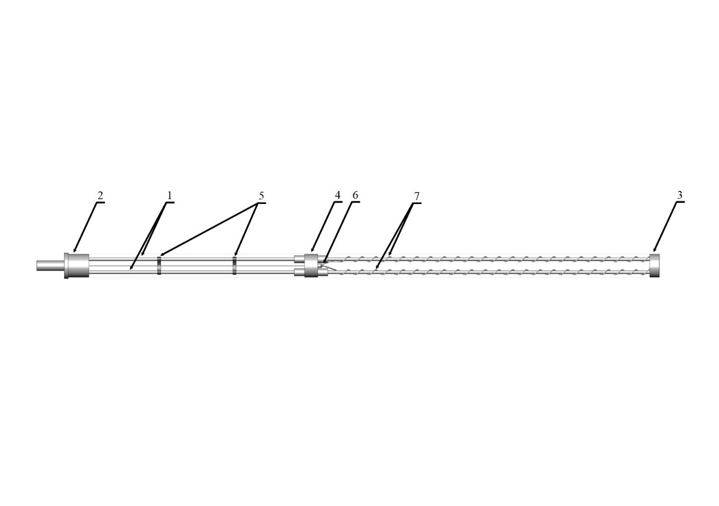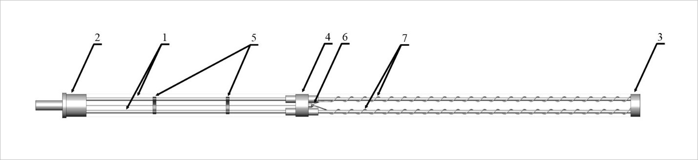 Fig. 2. Internal part of the device: 1 – guides; 2 and 3 – fixing elements; 4 – system fixing element; 5 – auxiliary fixing elements; 6 – LED; 7 – signal transmission wires