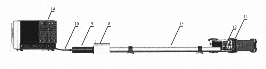 Fig. 3. General view of the measuring system: 8 – photomultiplier housing; 9 – photomultiplier; 10 – signal pickup cable from the photomultiplier; 11 – voltage pulse generator; 12 – signal transmission cable for the generator; 13 – light-insulating housing; 14 – oscillograph