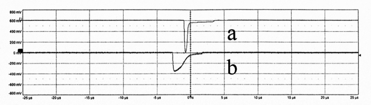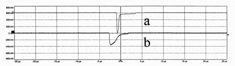 Fig. 4. Signals from two wavelength-shifting optical fibers – without defects (a) and with defects (b). The abscissa axis shows the signal duration, and the ordinate axis – the amplitude. The decrease in signal amplitude during the passage of optical waves through a damaged fiber relative to an undamaged fiber was more than 40%, and such a fiber cannot be used in a detector system