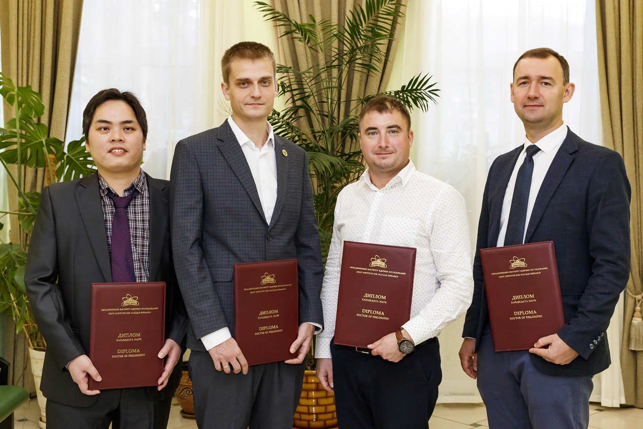On 13 October, an award ceremony of diplomas on conferring academic degrees took place at the JINR Scientists’ Club. Four Candidates of Sciences received their diplomas. By tradition, the event was held in a festive atmosphere with the participation of representatives of the JINR Qualification Committee, guests, and scientific secretaries of Dissertation Councils, at meetings of which the defences took place.