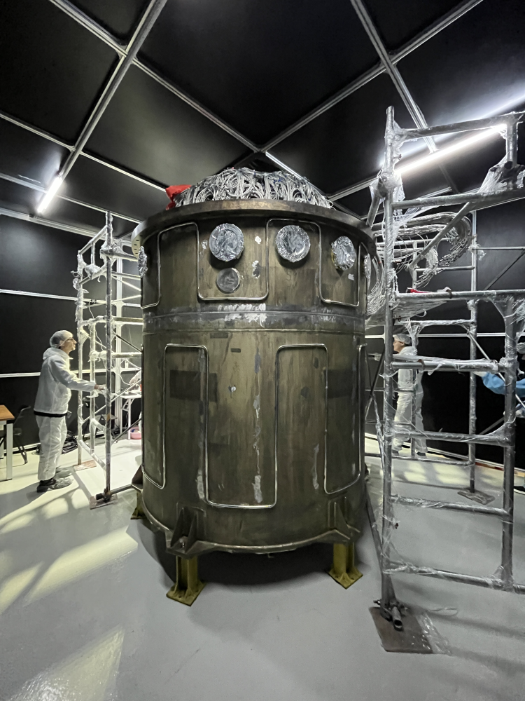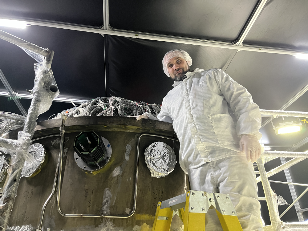 Nikolai Anfimov next to the steel tank containing the TAO Detector