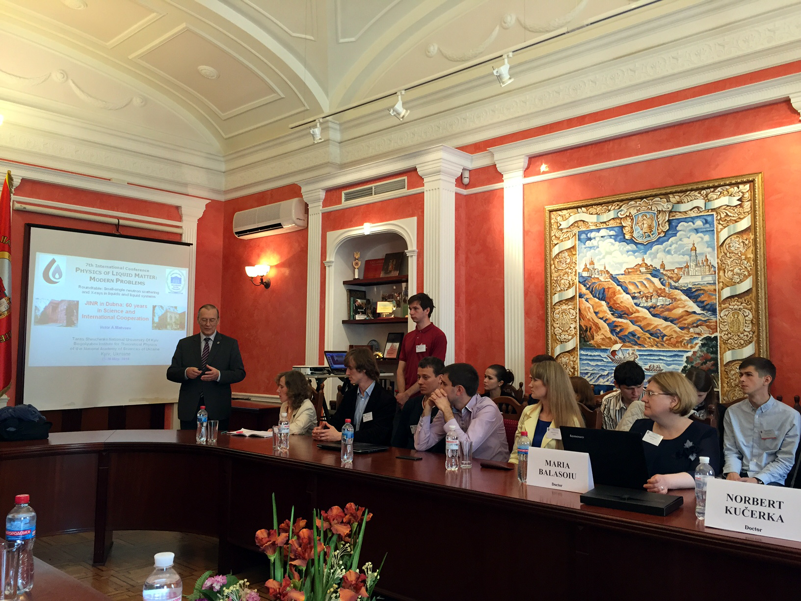 Дни ОИЯИ в Киеве завершились круглым столом в рамках международной конференции «Физика жидкостей: современные проблемы», на котором с докладом об ОИЯИ выступил директор Института В.А.Матвеев. На круглом столе также выступил академик НАНУ Л.А.Булавин с рассказом о 50-летней истории плодотворного сотрудничества физического факультета Национального Киевского Университета и Объединенного Института. Полномочный Представитель Правительства Украины Б.В.Гринев доложил о текущем состоянии взаимодействия научных и учебных организаций Украины с ОИЯИ.