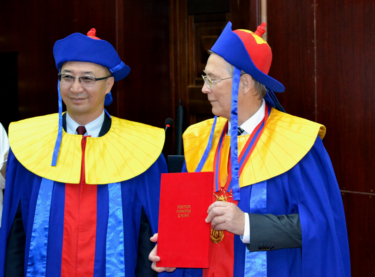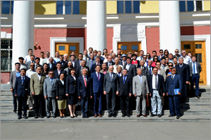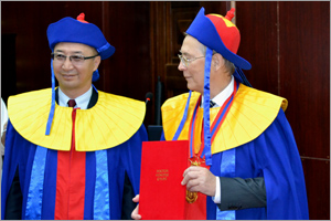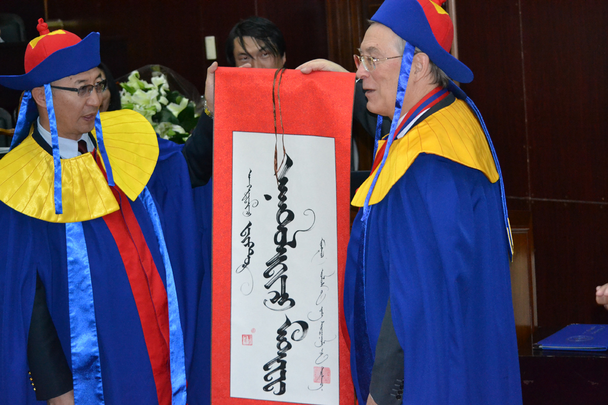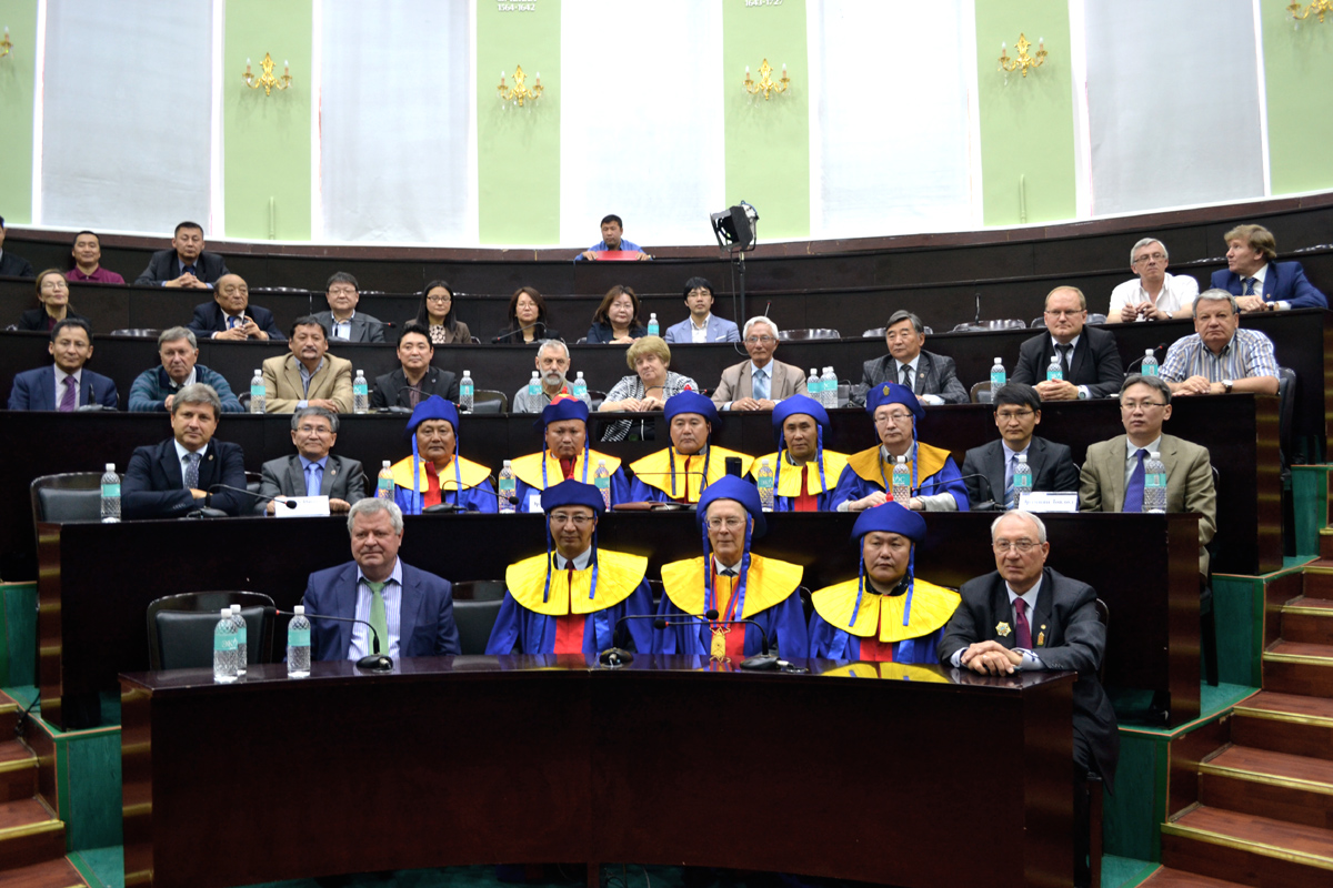 Открытию конференции также предшествовала встреча у президента НУМ доктора Р.Бат-Эрдэнэ и торжественная церемония присвоения директору ОИЯИ В.А.Матвееву звания почетного доктора Национального университета Монголии. В прошлом этого почетного звания удостоились директора ОИЯИ Н.Н.Боголюбов и В.Г.Кадышевский.
