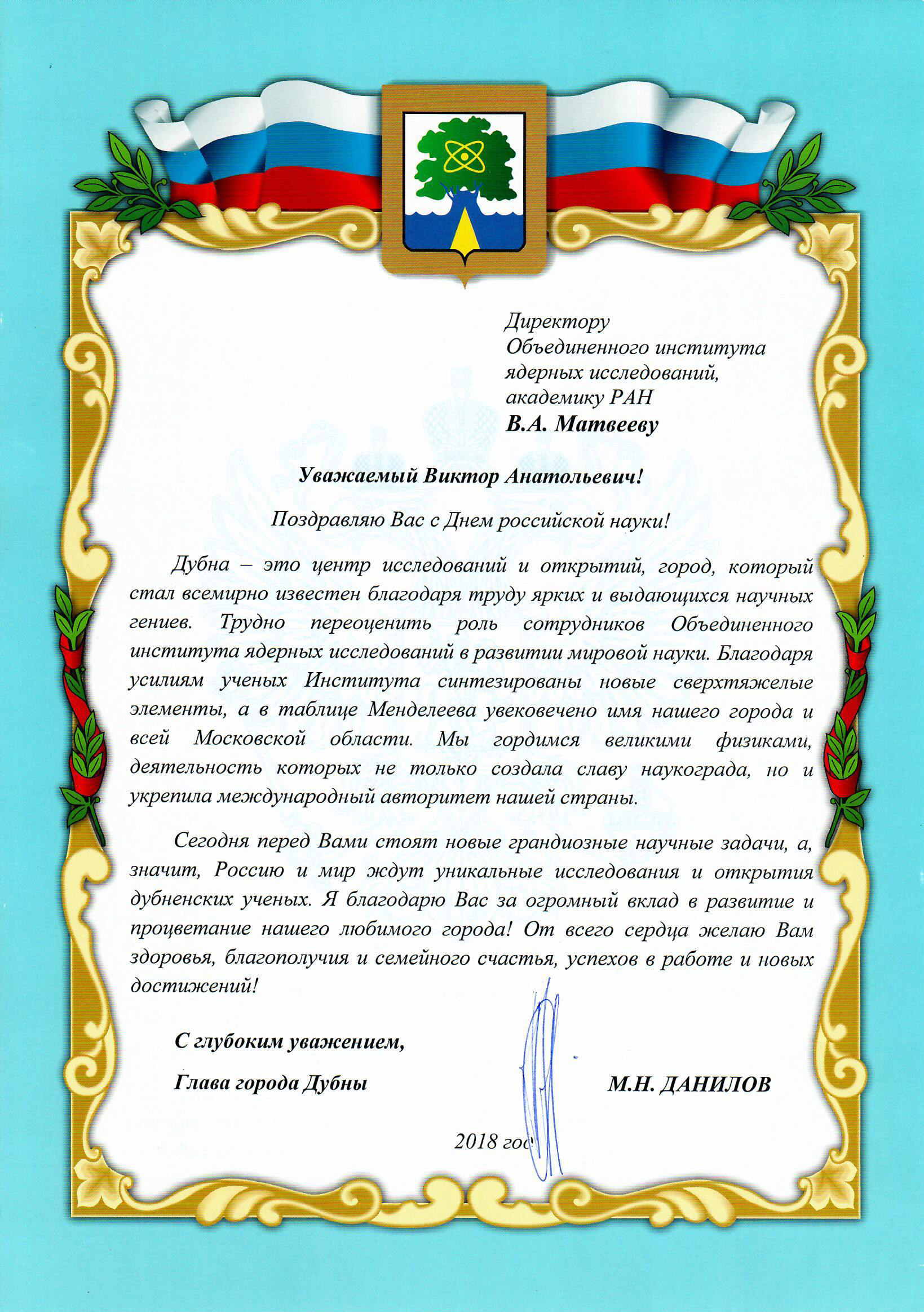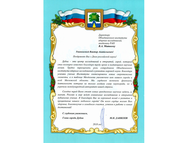 Dubna City Administration congratulated JINR