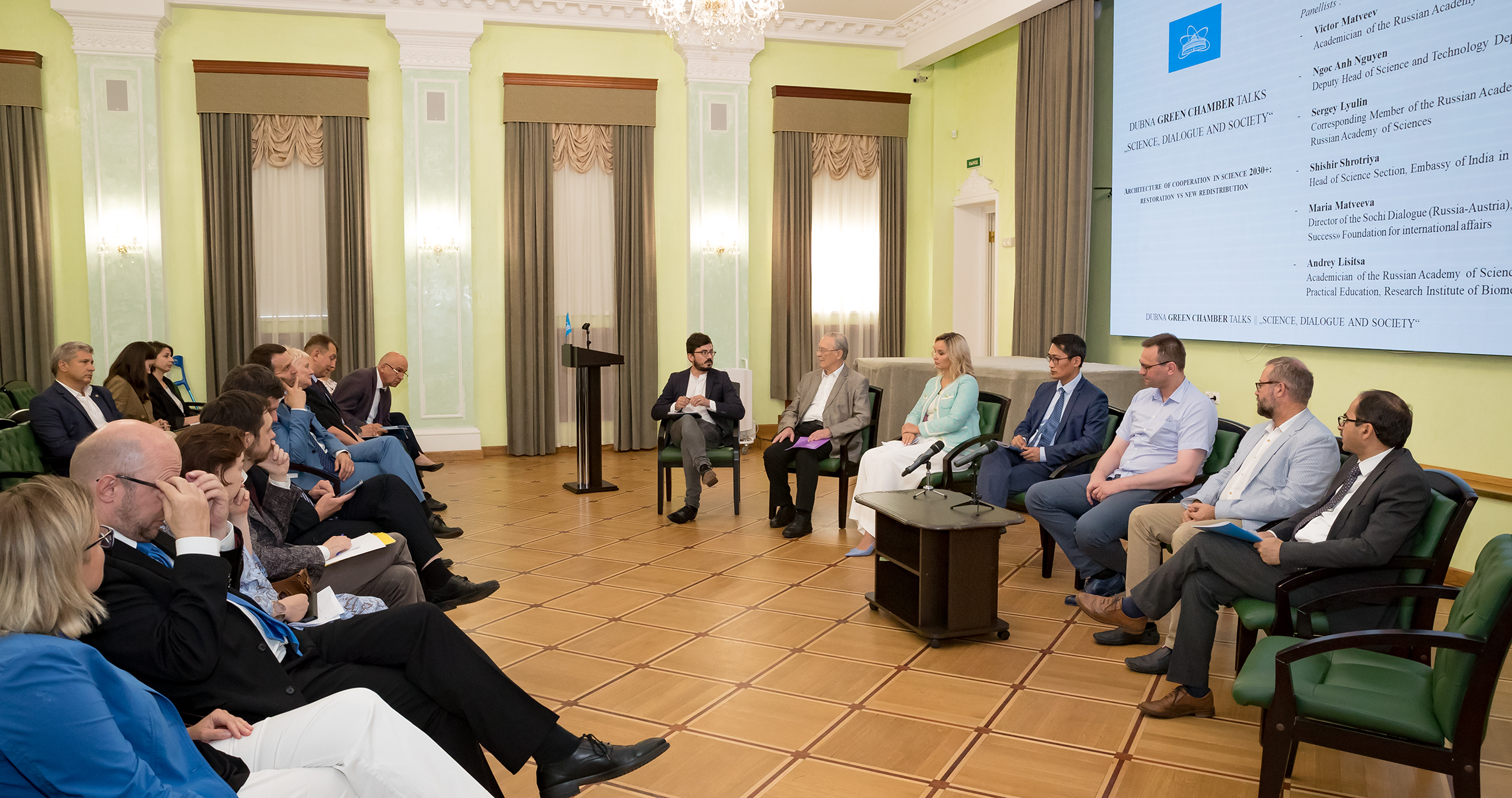 On 12 July 2022, the Joint Institute for Nuclear Research hosted a series of discussion meetings “Science, Dialogue and Society” in the frames of the informal expert science diplomacy club DUBNA GREEN CHAMBER TALKS. The first meeting of the series focuses on topic “Architecture of cooperation in science 2030+: restoration vs new redistribution”.