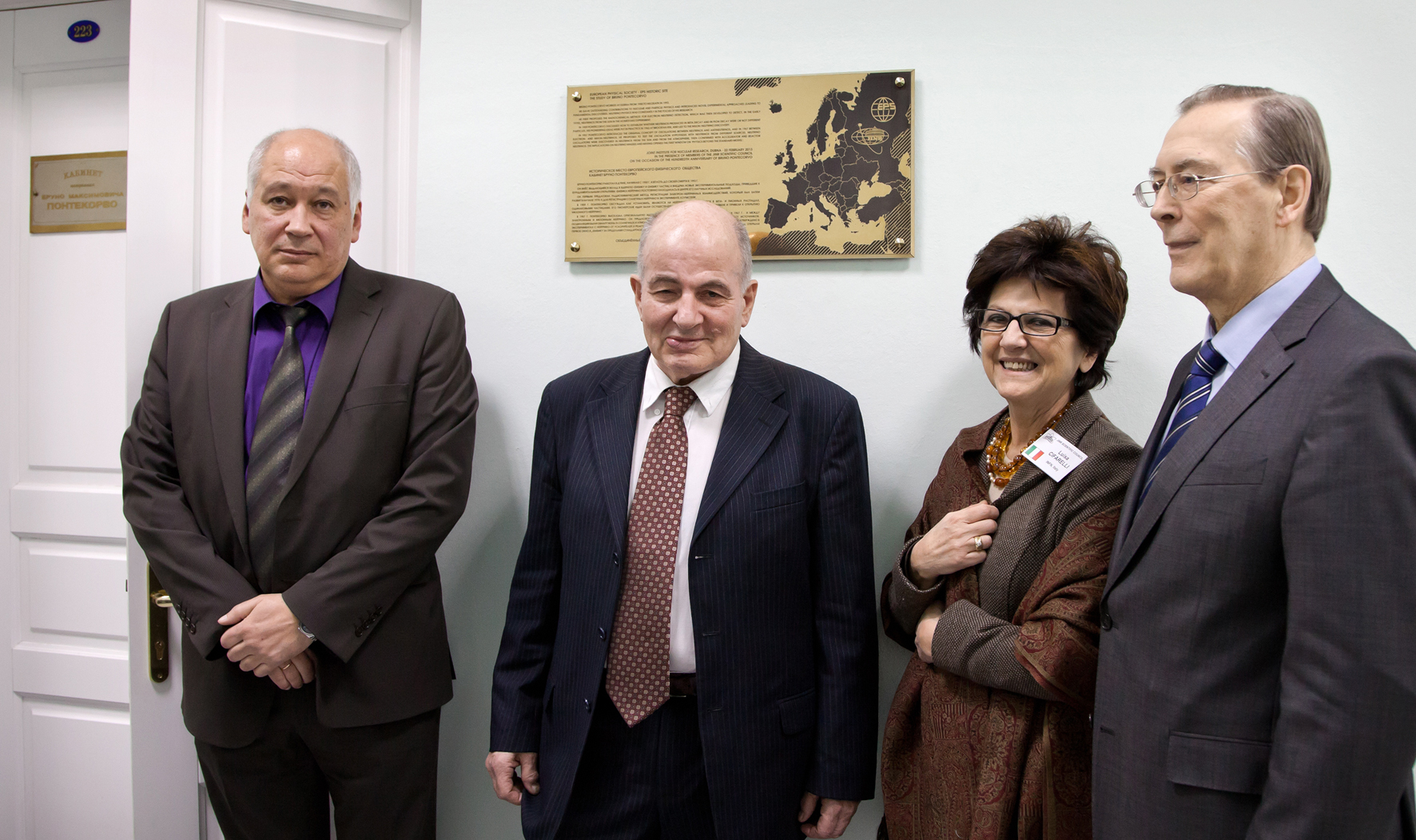 А.Г. Ольшевский, Д.Б. Понтекорво, Л. Чифарелли (Италия), В.А. Матвеев у мемориального кабинета Б.М. Понтекорво.