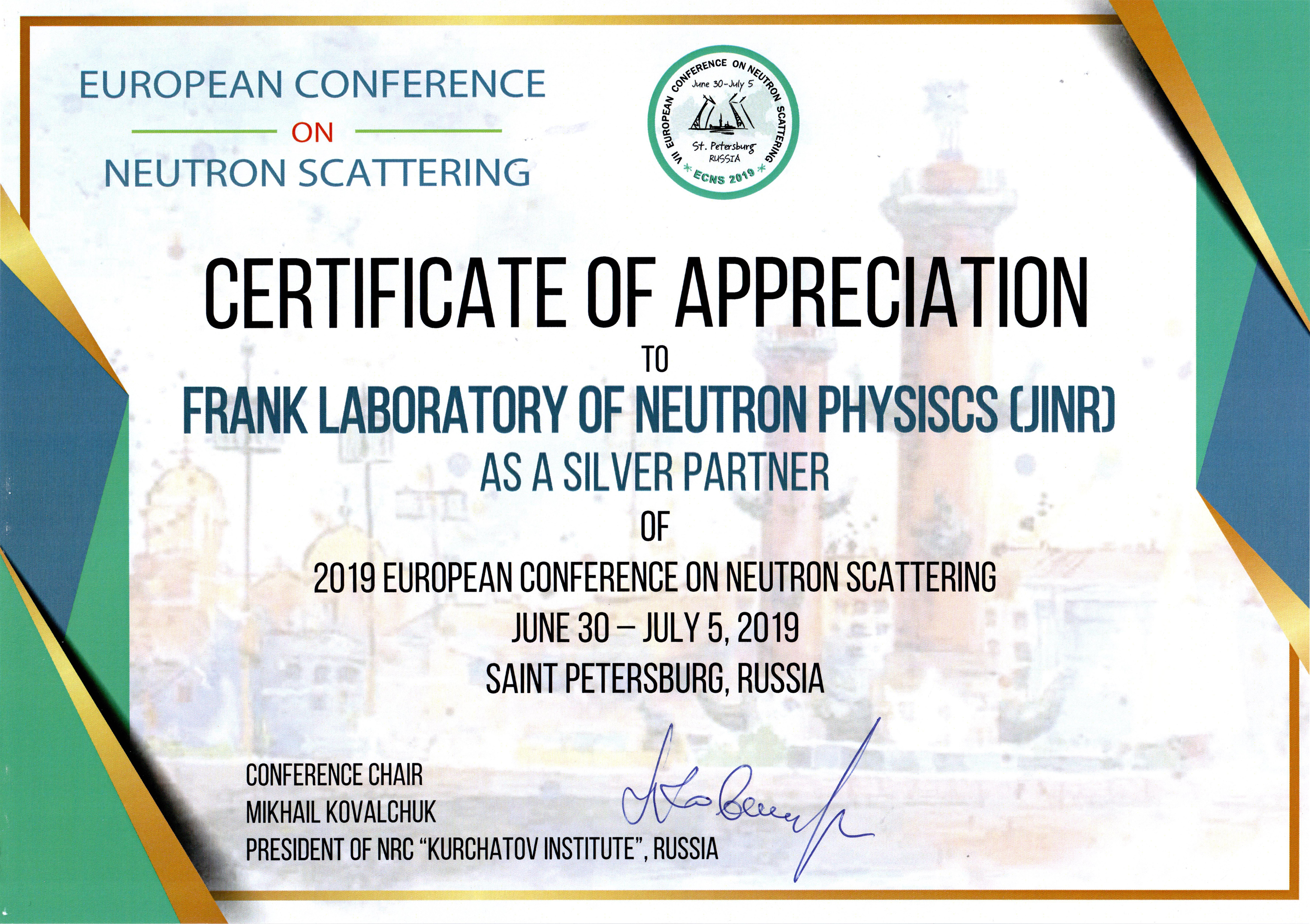 В ходе конференции вручалась медаль Российского нейтронографического общества «За выдающийся вклад в развитие теории и практики нейтронного рассеяния». В этом году лауреатом стал представитель ОИЯИ, главный научный сотрудник ЛНФ, проф. доктор физ.-мат. наук А. М. Балагуров. ОИЯИ принял самое активное участие в ECNS-2019. Делегация ОИЯИ (свыше 30-ти сотрудников ЛНФ) представила результаты своих исследований на нейтронных источниках ИБР-2 и ИРЕН; в том числе от ОИЯИ были сделаны 1 пленарная лекция и 8 приглашенных докладов. В ходе традиционной выставки нейтронных центров стенд ЛНФ знакомил участников конференции с работой и планами развития нейтронных источников ОИЯИ. Участники конференции и сателлитных микросимпозиумов смогли получить самую полную информацию о возможностях действующих спектрометров и деталях получения экспериментального времени на ИБР-2 в рамках реализации политики пользователей.